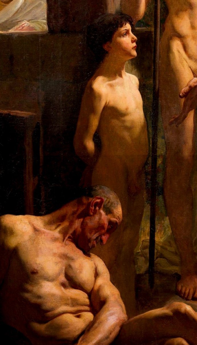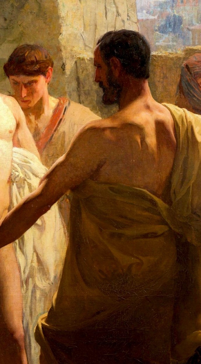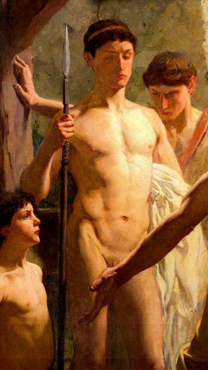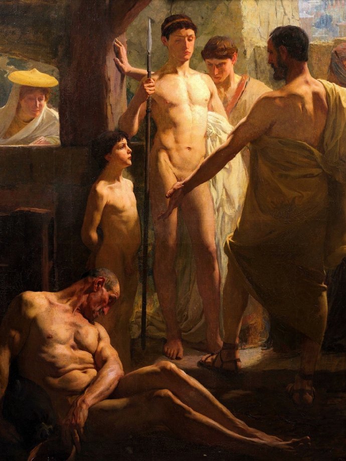 畫面描繪了斯巴達人教育年輕人的方式,他們會讓奴隸喝醉,然後將他們醉酒的醜態展示給孩子們,以此來告誡年輕人遠離飲酒。