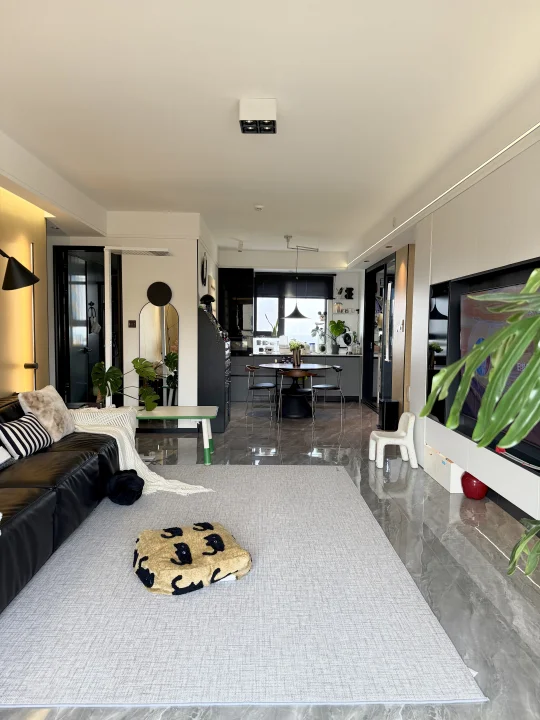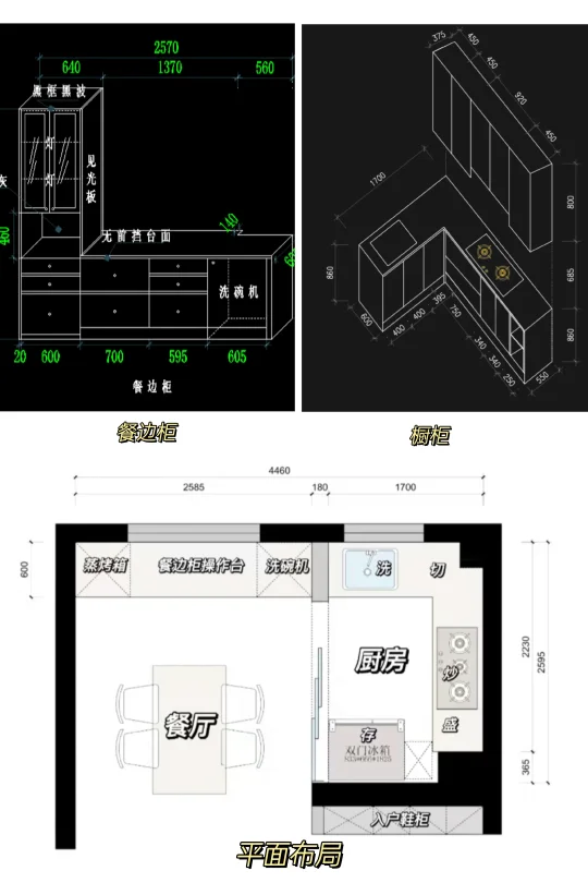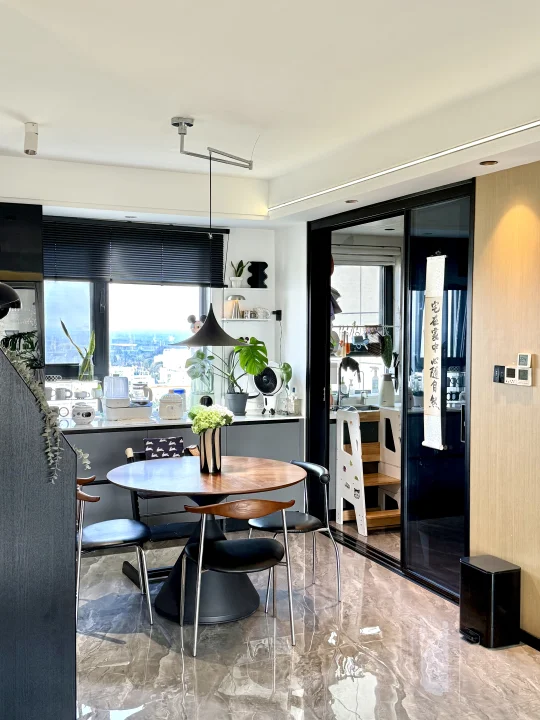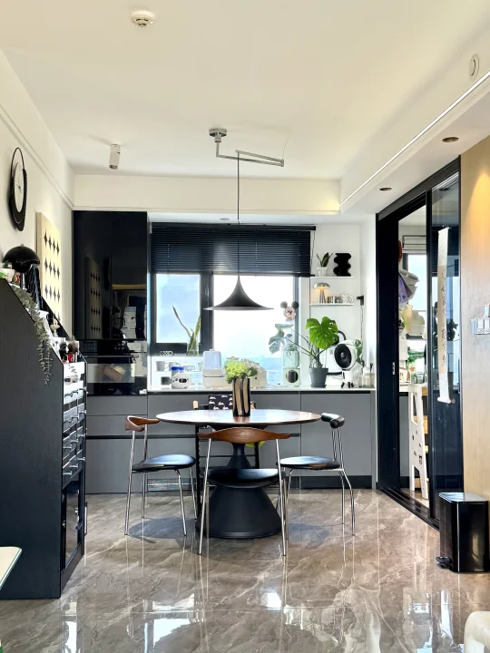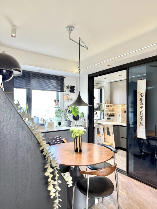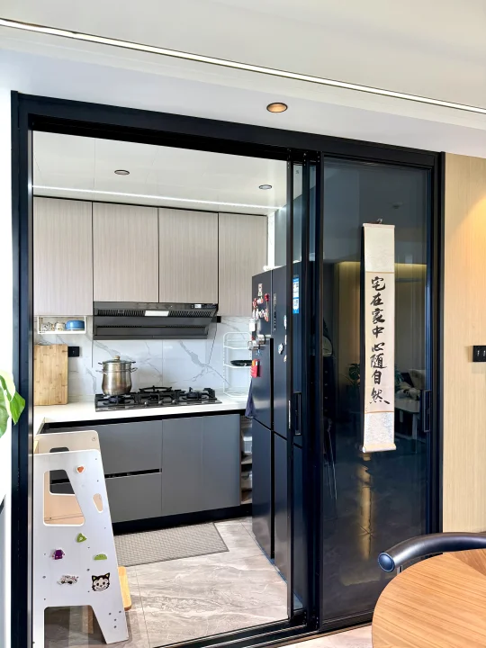 厨房我家做了的三联动玻璃推拉门,一拉全部收到冰箱侧,冰箱放厨房 平时下厨真的很方便!餐厅厨房统一橱柜台面和高度,打开门秒变开放式大厨房既视感~