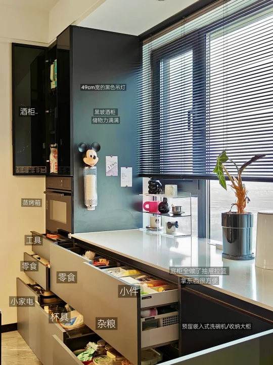 石英石台面+6个储物收纳抽屉+2扇玻璃酒柜、还做了嵌入式蒸烤一体机和洗碗机 ,右墙还安装了管线机!