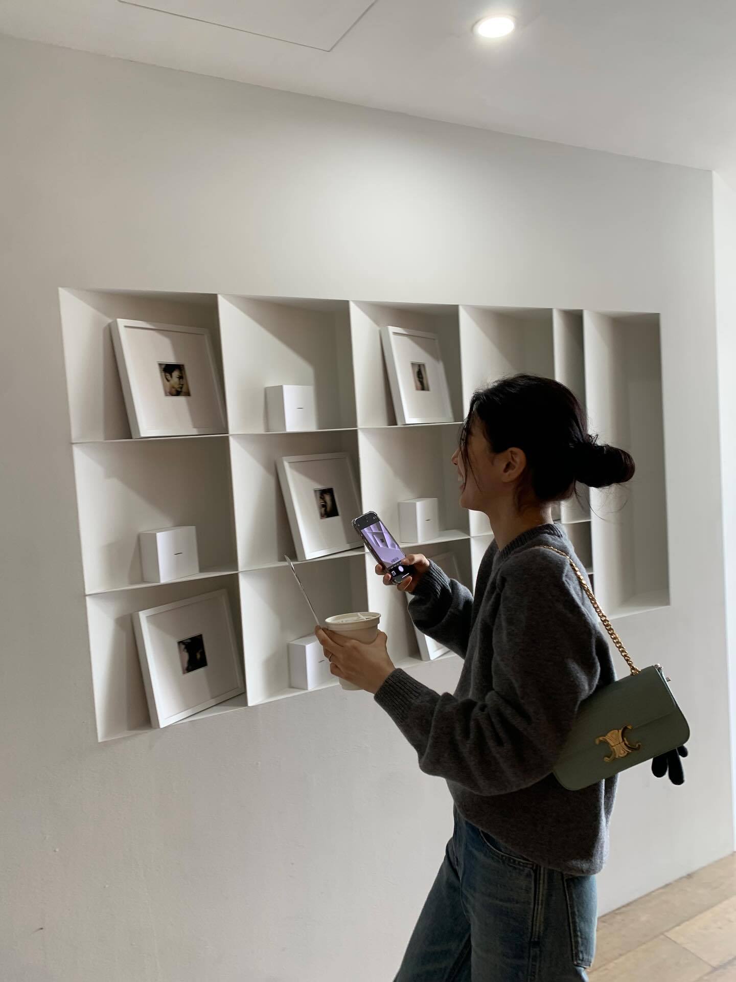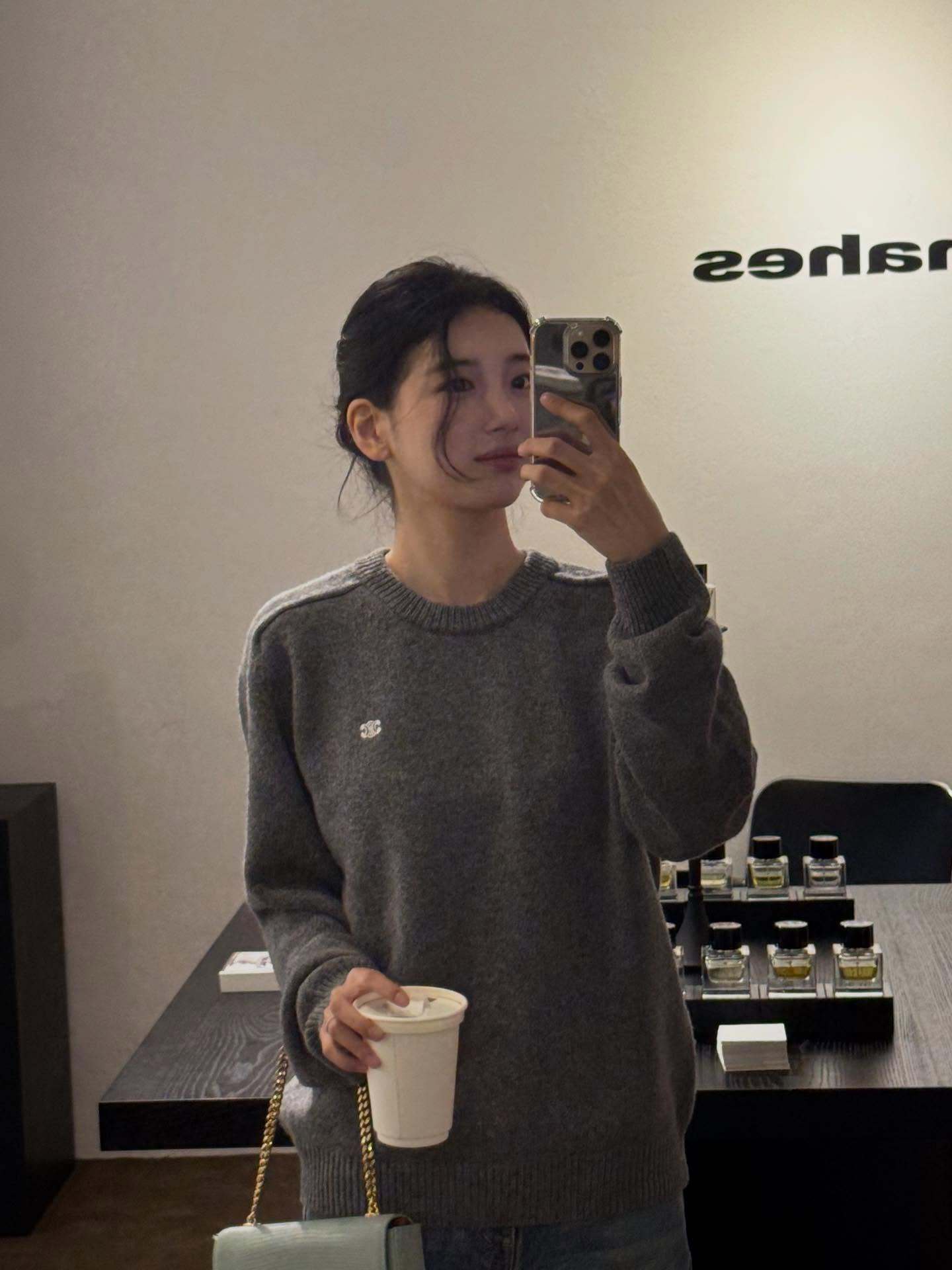 裴秀智的秋日穿搭,CELINE灰色毛衣搭配牛仔裤,点睛之笔的薄荷色CELINE TEEN TRIOMPHE手袋,轻轻松松就很美~