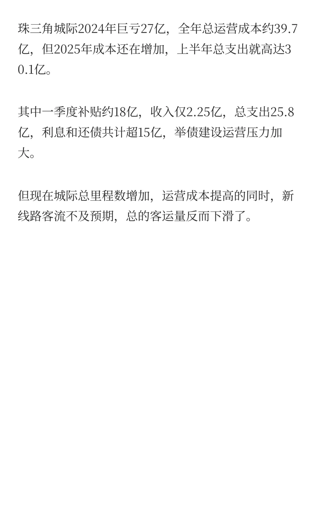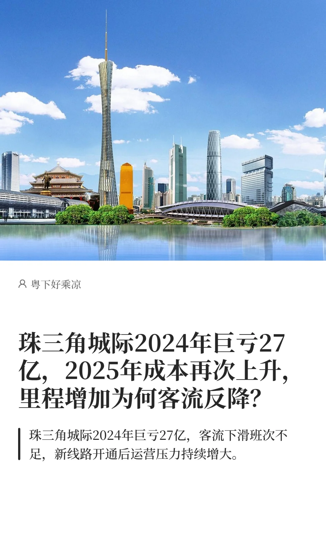 珠三角城际2024亏27亿,2025年成本再次飙升