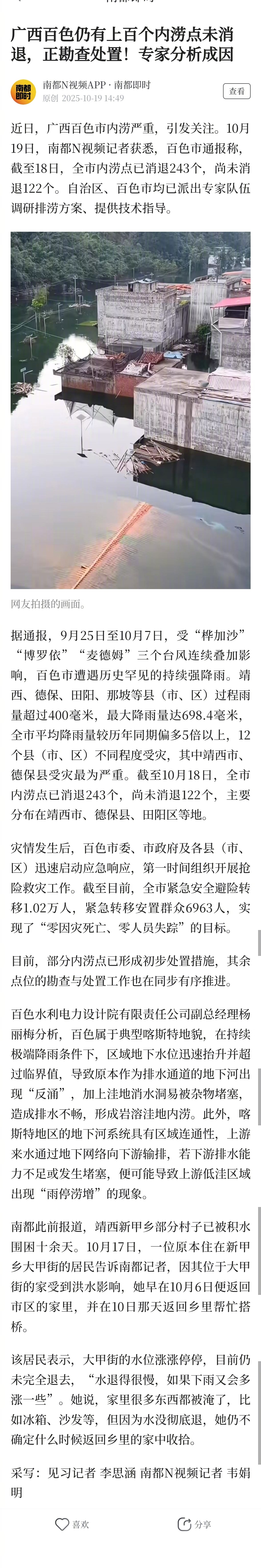 【#广西百色仍有上百个内涝点未消退#,正勘查处置!专家分析成因】#广西百色内涝#近日,广西百色市内涝严重,引发关注。10月19日,南都N视频记者获悉,百色市通报称,截至18日,全市内涝点已消退243个,尚未消退122个。自治区、百色市均已派出专家队伍调研排涝方案、提供技术指导。