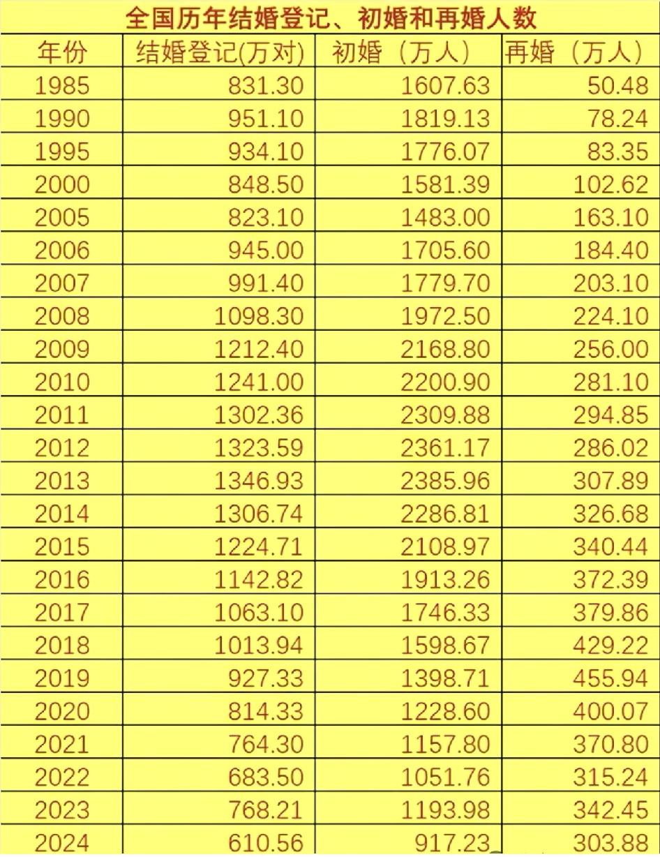 初婚人数首次跌破一千万。 有砖家说:房价高企不是结婚率下跌的主要原因(意思是房价不是天然的避孕药),是经济发展结婚率自然下降,经济越发展,年轻人越没有家庭责任感。可是结婚人数从2013年的1346万到2024年的610万暴跌式腰斩怎么解释?