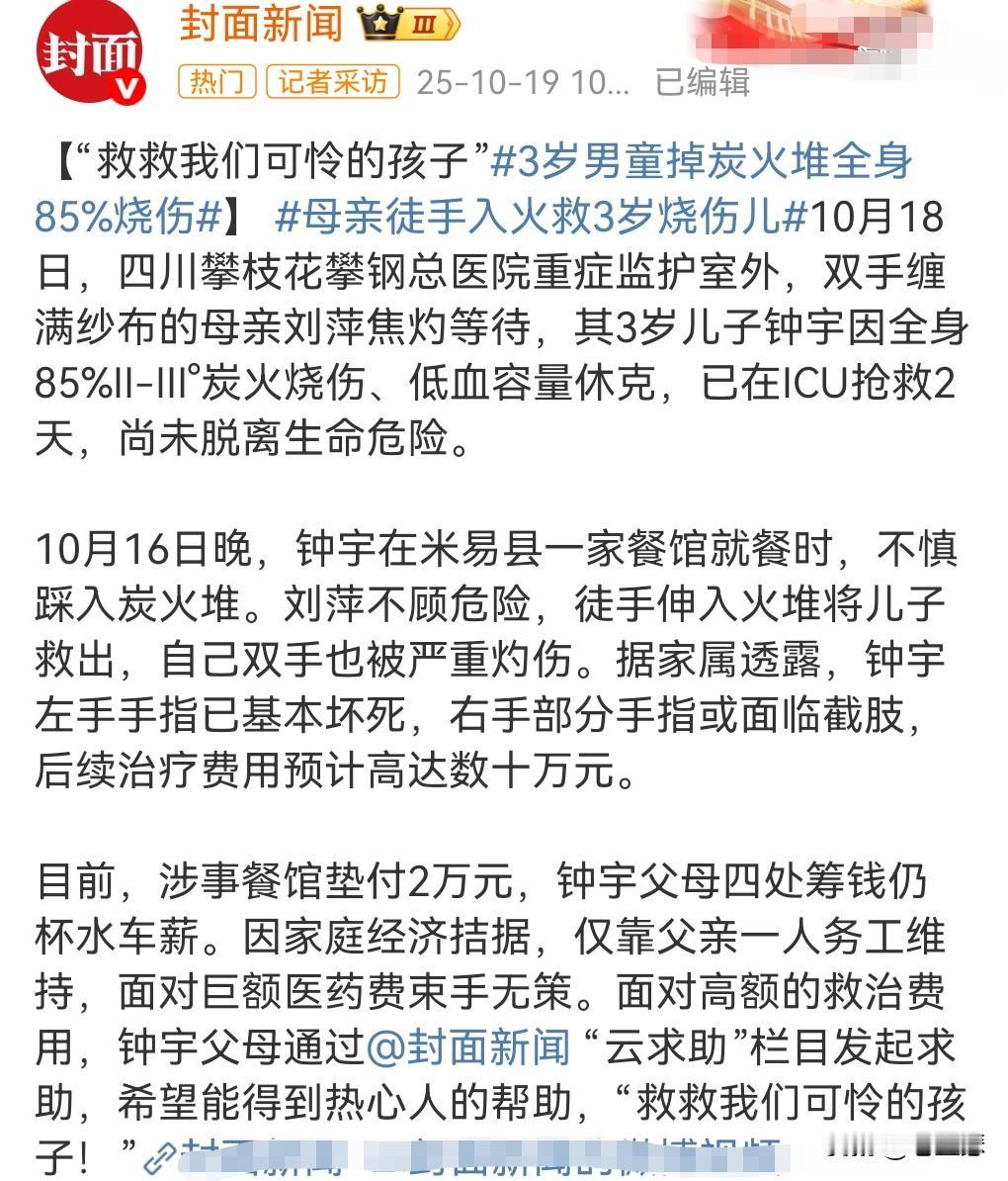 这真的是太不幸了。 10月19日在网上看到这么一起悲剧。 10月16日,母亲徒手入火救3岁烧伤孩子。 母亲也受伤了,不过孩子的伤情非常的严重。截至19日都没有脱离生命危险。 那炭火堆,没有明火,看上去就像沙子一样。 也没有什么警示牌,餐馆才拿了2万块,这也太少了,餐馆要负很大的责任。 费用将会非常的高昂,可能高达几十万。这个家庭无力承担。 并希望得到大众的帮助。