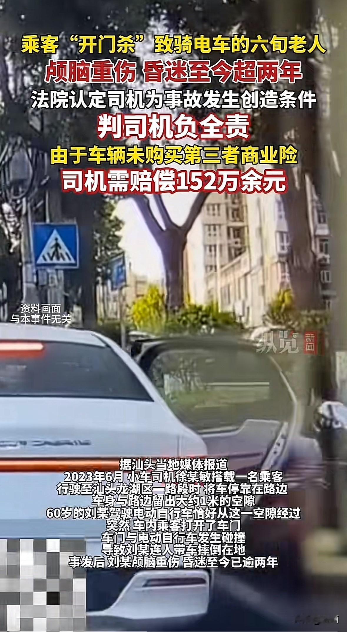 广东汕头曾发生一起“开门杀”事故。司机徐某敏路边停车,车身与路边留约1米空隙,乘客开门时撞上路过的60岁电动车骑手刘某。刘某颅脑重伤,昏迷两年多,鉴定为一级和八级伤残。 交警和法院都认定司机负全责,因其未确保停车安全,也没提醒乘客。司机没买商业险,最终法院判交强险赔14万多,司机自己赔152万,刘某共获赔166万。 这事儿看着是乘客开门,但司机责任跑不了。停车选位、提醒乘客都是司机的活。真得学学“荷氏开门法”,用离车门远的手开门,能自然转头看后方。不管司机还是乘客,开门前多瞅一眼,别让小疏忽酿成大悲剧。