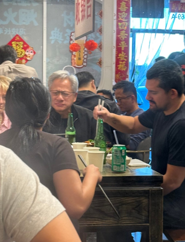 黄仁勋一家去吃火锅被偶遇! 据网友爆料,日前黄仁勋和老婆,孩子到湾区一家冯校长老火锅吃饭,还配了啤酒和雪碧。 从饭店装修看,比中国的一些火锅店还中式,四方桌配板凳,坐着很不舒服。 生意好这种桌椅,能提高翻台率。特别是腰不好,坐一会都想走。