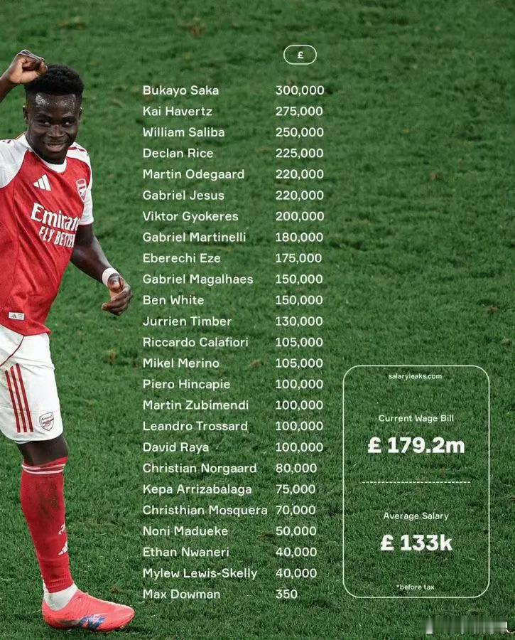 列表包括了25名球员,从顶薪的萨卡(30万英镑)到最低薪的道曼(350英镑)。