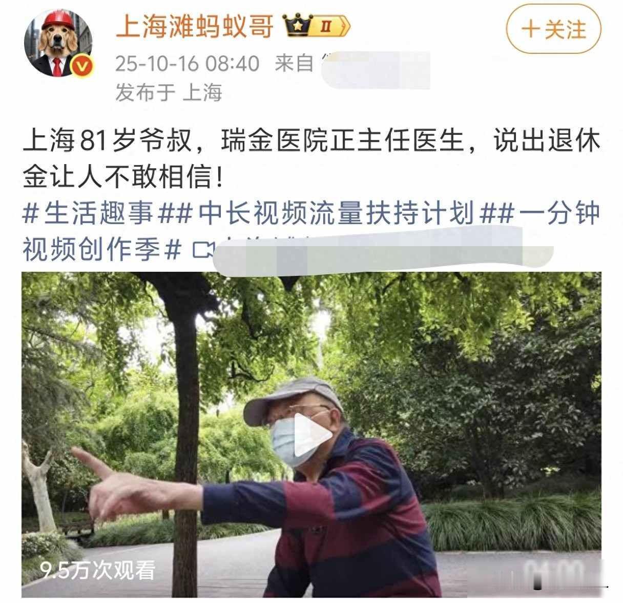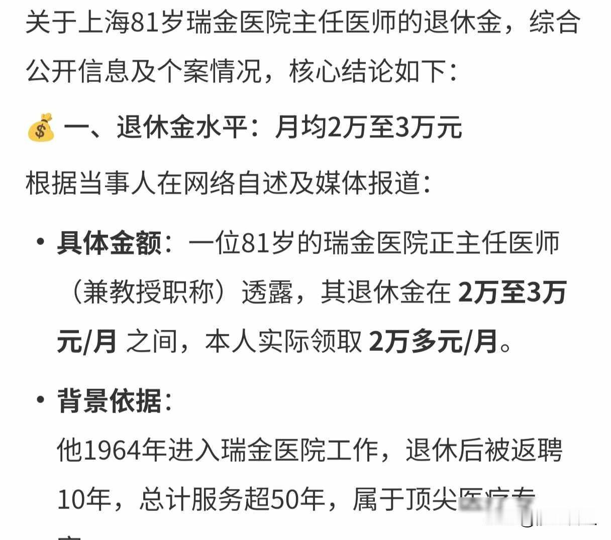 上海医生月领2万,乡镇教师退休反超在职,养老金谁在吃红利? 一位八十一岁的老医生,以前在上海的大医院当主任医师,退休后每个月能拿两万到三万,视频传到网上,大家一看就议论开了,他没违反规定,该拿的拿,可这数目实在让人心里不踏实。 另一边,有些乡镇小学老师还在上班,每月挣六千左右,等退休了反而能拿八九千,这不是个别情况,是老制度留下来的问题,体制内的人缴得多,基数也高,退休金自然多,企业职工不一样,缴得少,退休金也就少,两拨人之间的差距越拉越大。 有人喊着给农民涨养老金,提到一千块,听着是不错,可钱从哪儿来,光靠政府补贴哪够,德国日本那边,养老金跟个人交的钱、工资挂钩,没人觉得不公,咱们这儿,很多人对身份不同拿的钱多,心里就不服。 现在延迟退休要来了,大家怕退得晚,拿得少,可体制内的老人,退休金还在一点一点涨,广东有地方因为老师退休金太高,被人要求公开明细,结果也没个说法,全国有多少人月拿两万以上,没人说清楚,但企业职工平均才三千五,差了快好几倍。 大家不是眼红谁拿得多,是想不明白为啥能拿这么多,规则不透明,差距明摆着,心里都憋着气,改制度不能光盯着农民或停了高薪,得来点真格的,把规则统一了,管住个人账户,试试分档领钱,这才是关键。