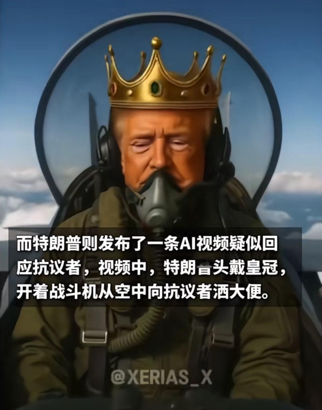 特朗普:我就是独裁者,我就是国王,抗议者只配吃大便! 10月18日,全美50个州、超2600场、近700万人走上街头参与反特朗普集会,高呼“美国不要国王”,明确反对特朗普政府在移民、医疗、教育、立法等多个领域的政策,并担忧其权力扩张会损害美国的民主制度。 作为从不吃亏的特朗普立马在自家社交平台发布“带着王冠、开着战斗机的自己朝集会丢大便”的AI视频予以回应。视频中,特朗普头戴王冠,驾驶着一架印有金色“特朗普国王”字样的战斗机飞越疑似纽约时代广场的上空,向下面的大批抗议者倾倒下棕色的、类似粪便的污物。背景音乐还使用了电影《壮志凌云》的配乐《Danger Zone》。 这还没完,特朗普还转发了副总统万斯发布的另一段AI视频,其中描绘了民主党重量级人物(如前众议院议长南希·佩洛西)向特朗普下跪的场景。而且,白宫的官方账号也参与了相关内容的传播。 如今美国政府继续停摆,政治对立情绪高涨!对于支持者来说,老特很强硬;对于反对者来说,这是公开的羞辱和挑衅。 总之,特朗普的这段AI视频,不仅是一次针对特定抗议活动的粗鲁回应,更是美国政治生态、媒体技术演变和权力叙事在数字时代的一次集中体现。它模糊了政治与娱乐、事实与虚构、强硬与粗俗之间的界限,怎么说都是老特有理……