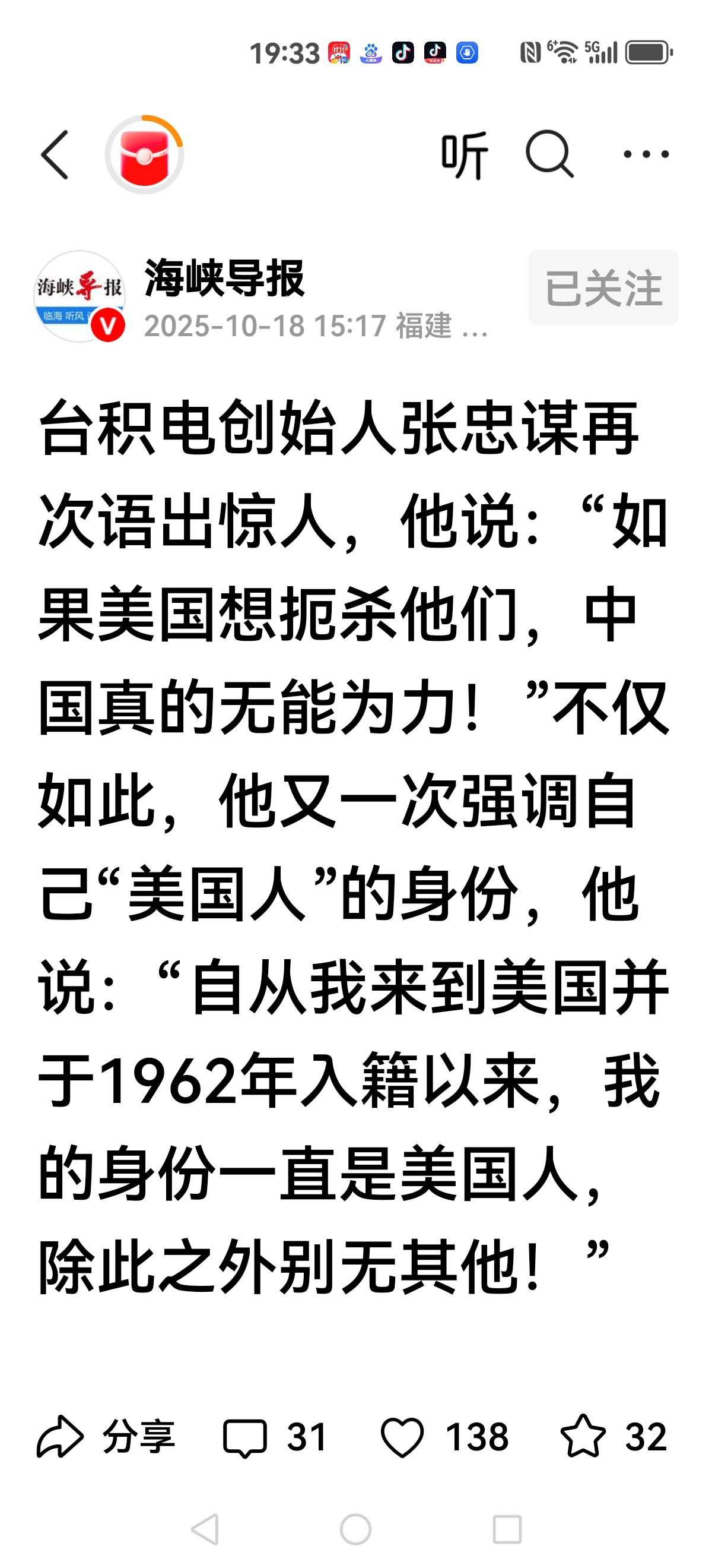 【中美绕不开的话题】 张忠谋口出狂言:如果美国想扼杀他们,中国真的无能为力。 美