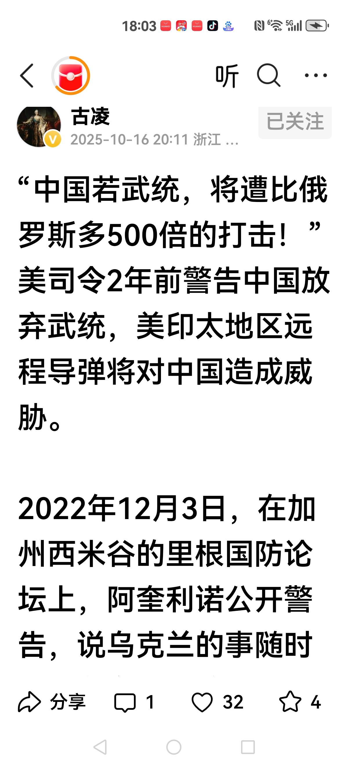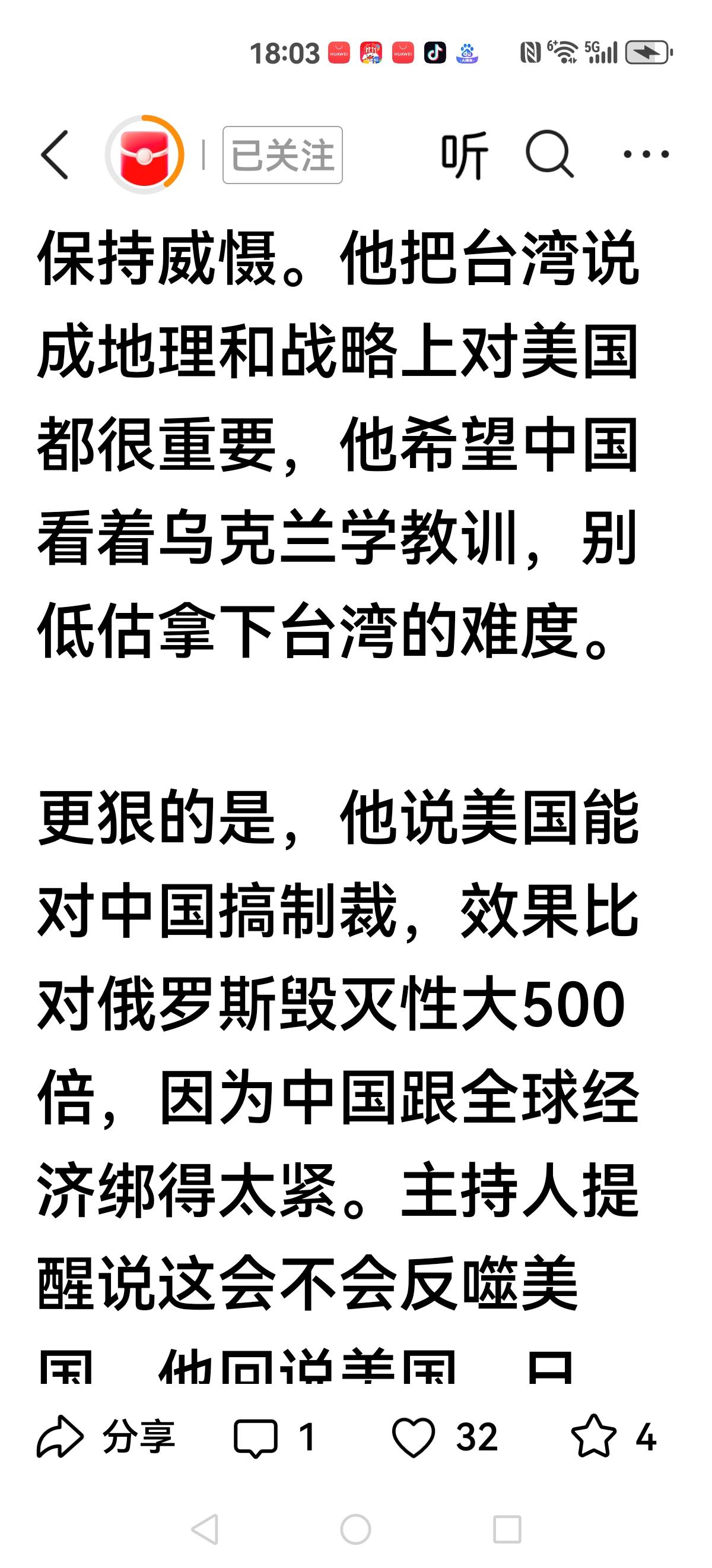 【中美绕不开的话题】 张忠谋口出狂言:如果美国想扼杀他们,中国真的无能为力。 美军司令2年前就说:如果我们武统,将遭遇比俄罗斯多500倍打击 英伟达黄仁勋说:英伟达从中国95%份额,降到0%。 金灿荣说:有两个愿望,一是湾湾回归祖国,二是2030年我们登月 中美绕来绕去的话题:稀土,芯片,大豆,统一,这也是相互争论,要靠武力解决的问题?