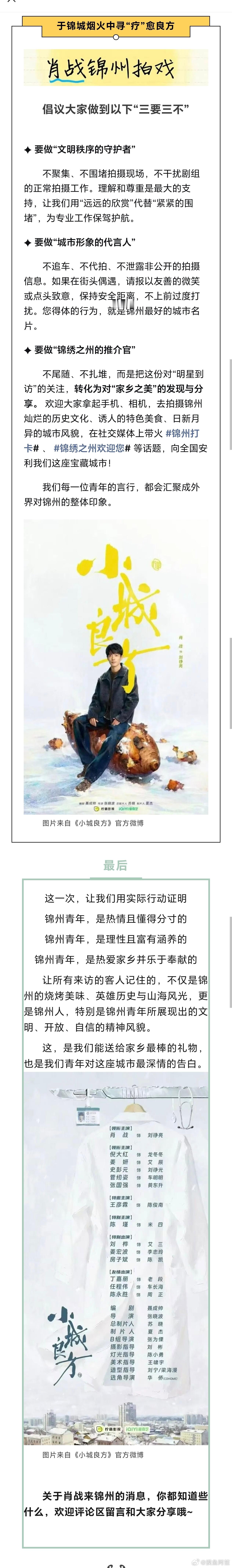 肖战一个人带火一座城锦州从上到下都好重视这次因为《小城良方》取景拍摄而让城市爆火的良机啊,其实我们东北很多的小城就是缺少一个被看见的过程,肖战作为顶流艺人的到来真的带来了特别多的关注,真的是一场双向奔赴的感人故事[哇]锦州到底有谁在啊