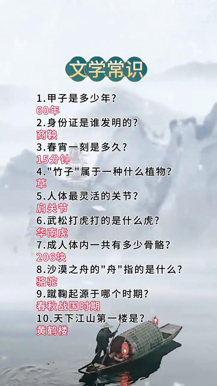 文学常识。 ·1.甲子是多少年?60年。 ·2.身份证是谁发明的?商鞅。 ·3.春宵一刻是多久?15分钟。 ·4."竹子"属于一种什么植物?草。 ·5.人体最灵活的关节?肩关节。 ·6.武松打虎打的是什么虎?华南虎。 ·7.成人体内一共有多少骨骼?206块。 ·8.沙漠之舟的"舟"指的是什么?骆驼。 ·9.蹴鞠起源于哪个时期?春秋战国时期。 ·10.天下江山第一楼是?黄鹤楼。