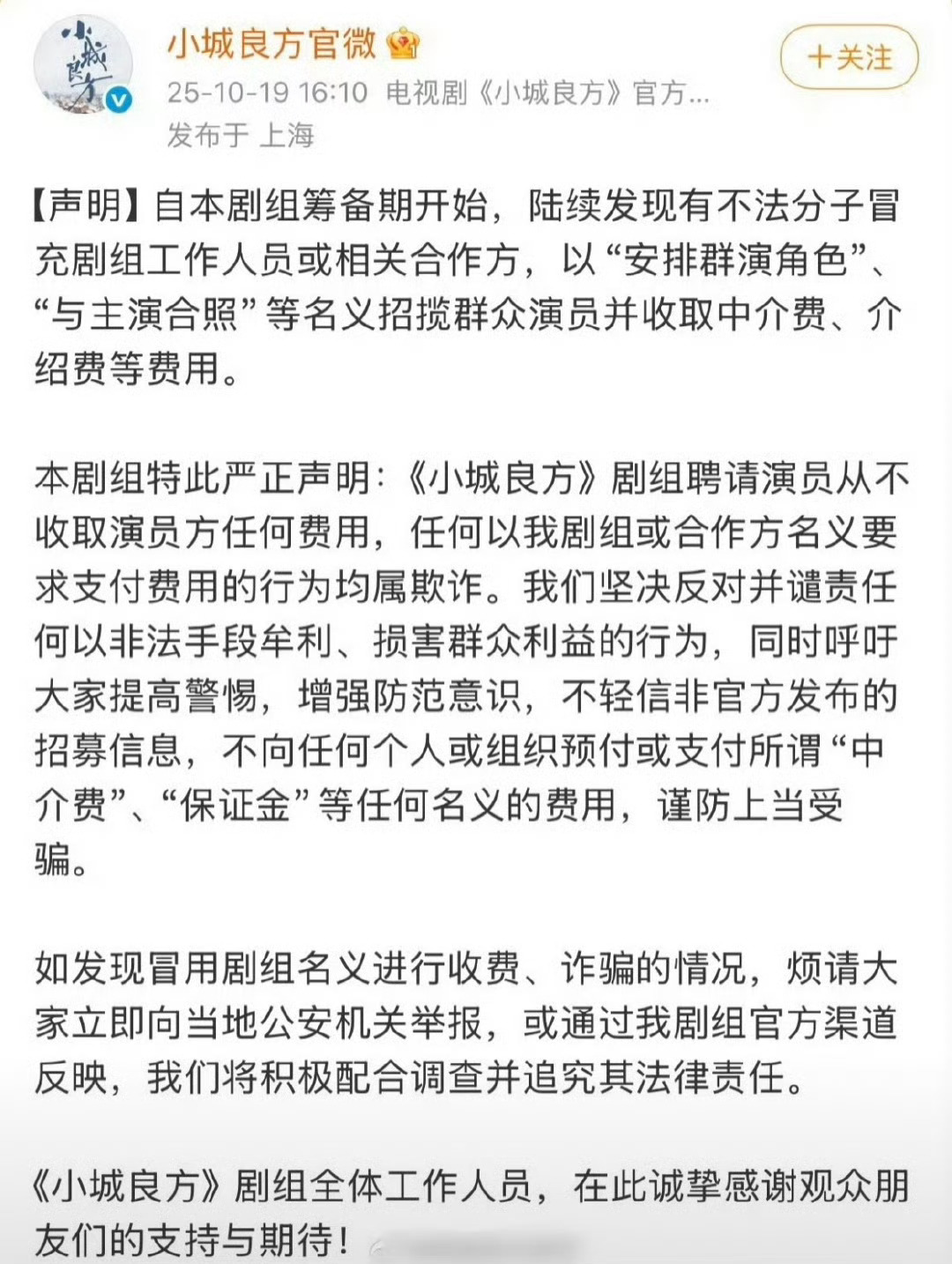 肖战小城良方发布声明:有不法分子冒充剧组工作人员或合作方,招揽群演收取中介费、介绍费。