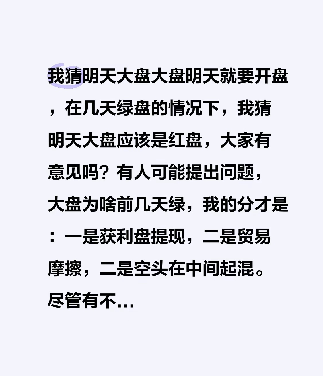大盘明天就要开盘,在几天绿盘的情况下,我猜明天大盘应该是红盘,大家有意见吗?有人可能提出问题,大盘为啥前几天绿,我的分才是:一是获利盘提现,二是贸易摩擦,二是空头在中间起混。尽管有不利因素,但总体向上向好上涨趋势不变,大盘要红要上4000点就要到来,让我们期待早日到来!股票财经a股