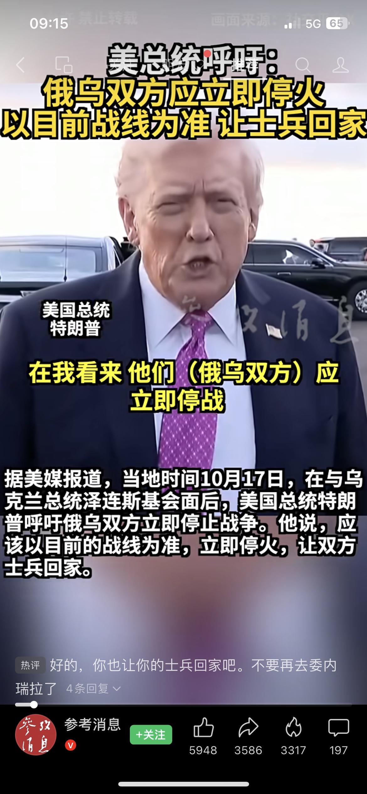 💥特朗普呼吁俄乌立即停火:以当前战线为准,让士兵回家 当地时间10月17日,特