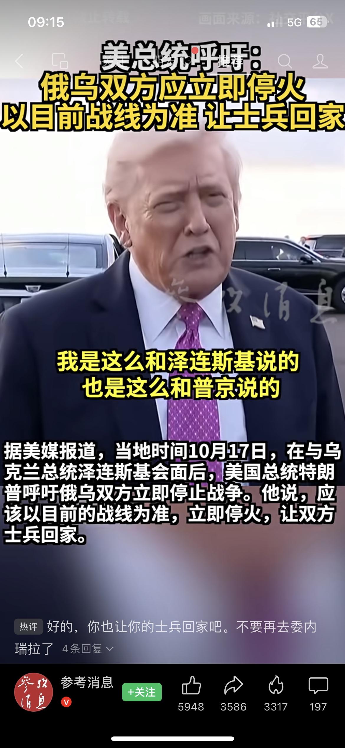 💥特朗普呼吁俄乌立即停火:以当前战线为准,让士兵回家 当地时间10月17日,特朗普在与泽连斯基会面后,呼吁俄乌双方立即停火,以目前战线为准,让双方士兵回家。他表示这是同时对泽连斯基和普京传达的立场。这一表态引发广泛关注,网友纷纷热议:“停火是好事,但和平的前提得是尊重各方主权啊”。国际局势 俄乌冲突