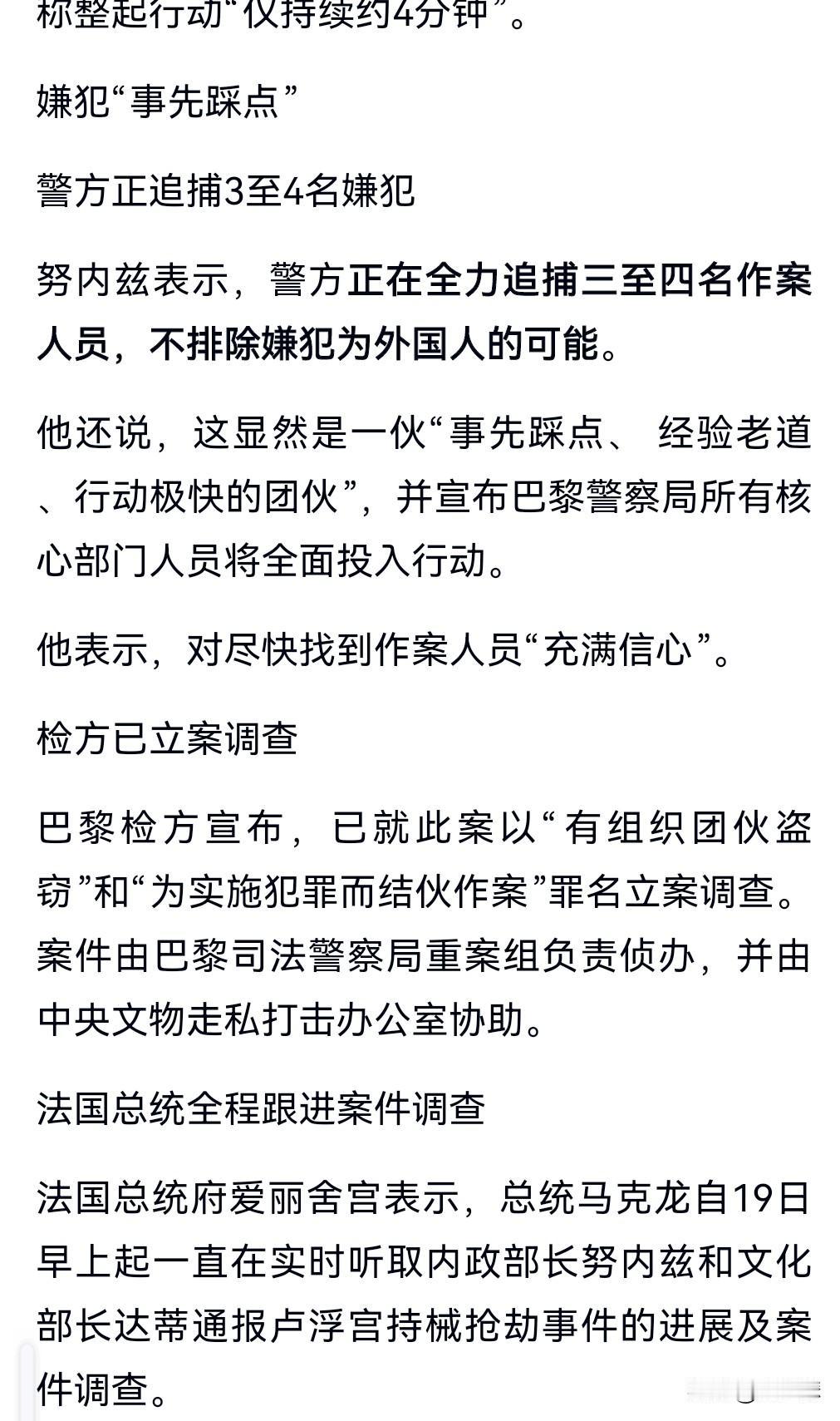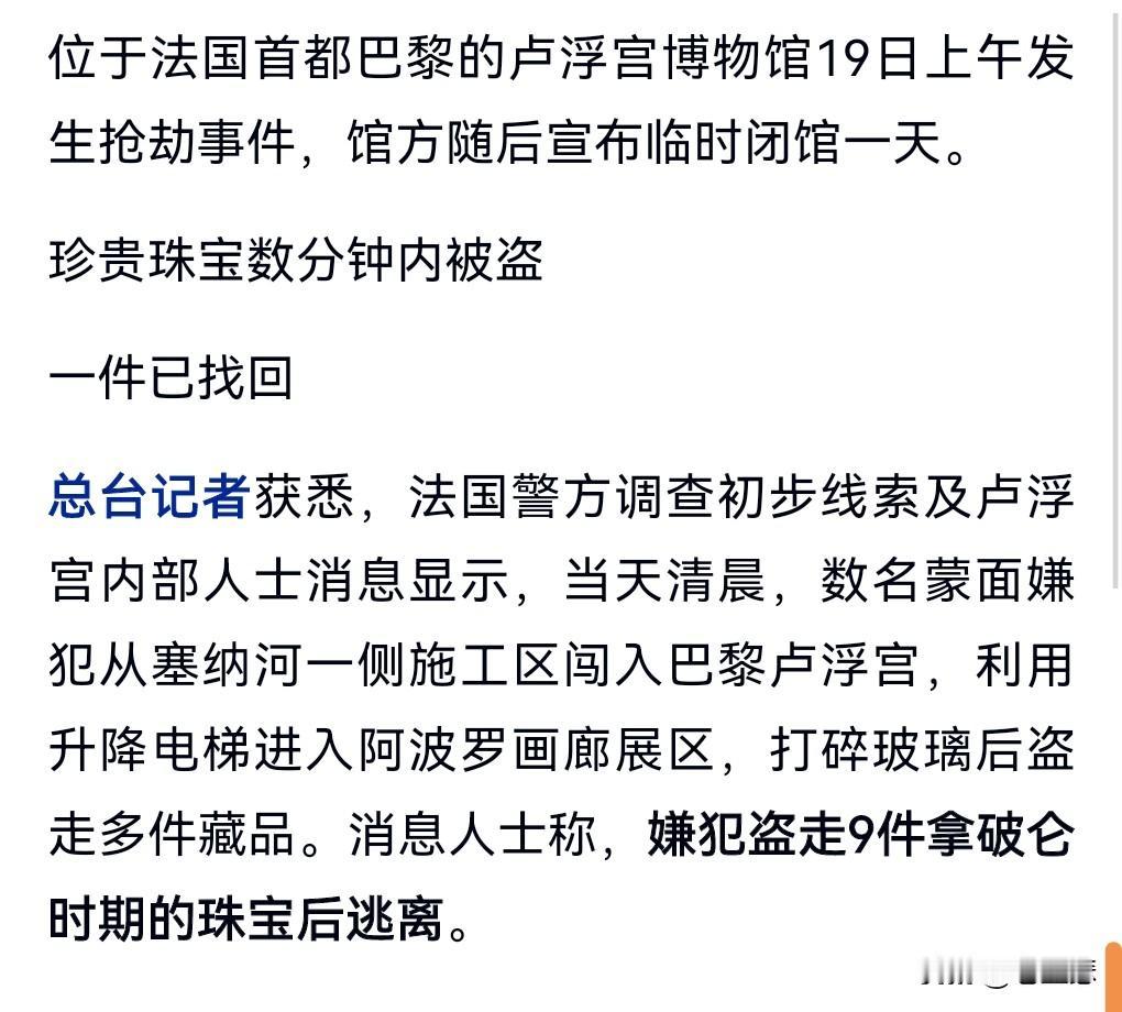 这真的是太炸裂了,简直是无法无天了。 10月19日,卢浮宫竟然被盗了。 几个犯罪分子仅用几分钟就盗走了9件拿破仑时期的文物。 其中有一件还掉在路上被找回来了。 这些人能够得逞。 这只能说明卢浮宫的安保措施实在是太弱了。