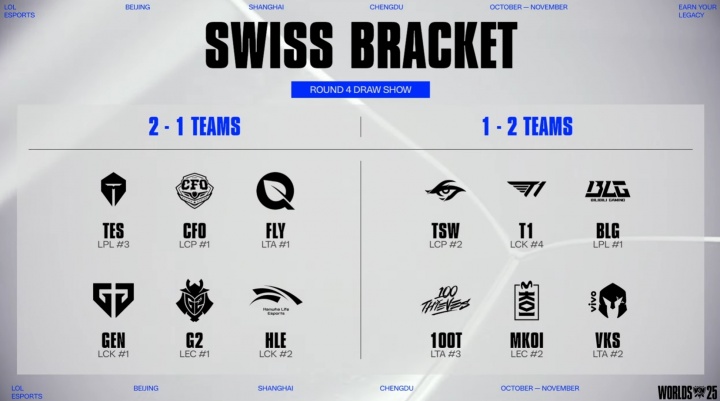 直播吧10月19日讯 S15瑞士轮第四轮抽签仪式正在进行中!第四轮抽签仪式依旧没有同赛区规避,但还是不会抽到交过手的队伍。