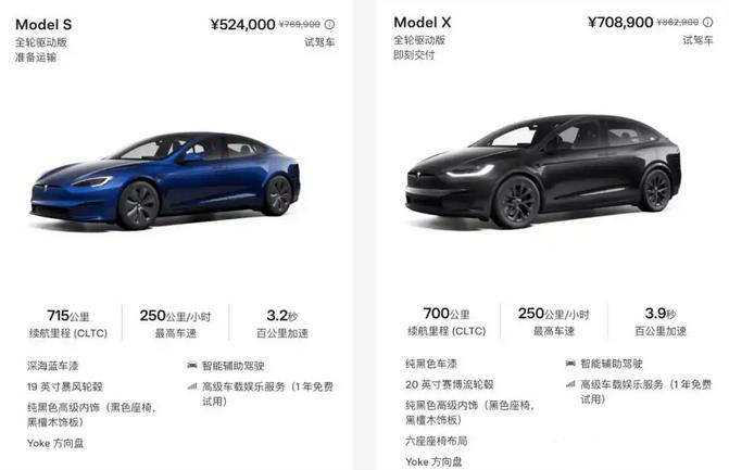 最高降幅24万元,特斯拉Model S/X试驾车大清仓 。 特斯拉中国近期针对Model S和Model X试驾车的清仓促销。 根据特斯拉中国官网信息,Model S试驾车售价从原价769900元降至524000元,降幅达245900元。 Model X试驾车售价从862900元降至708900元,优惠154000元。 不过需要注意的是,试驾车虽仍享受特斯拉官方提供的4年或8万公里整车质保,但不包含全新车的免费超级充电额度,后续充电需自行付费。其次为交付时间,此次清仓车型多为现车,付款后1-2周即可提车。 有供应链消息透露,清理老款库存为新一代Model S/X的国产做准备,特斯拉上海工厂已启动新款Model S/X的生产线改造。【来自懂车帝车友圈】