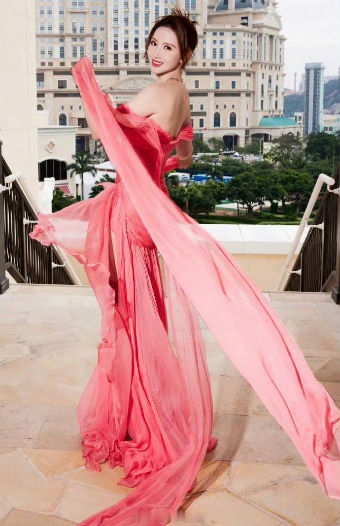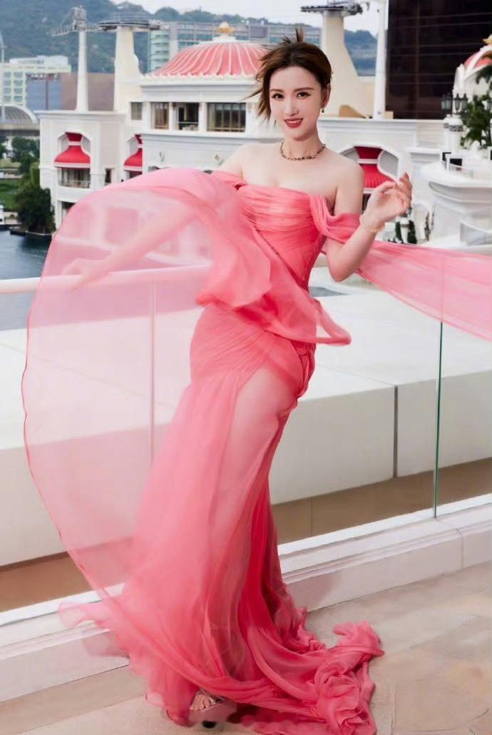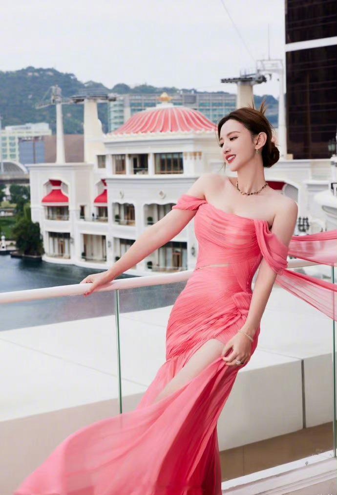田曦薇雾粉纱裙缀满星芒刺绣,立体花饰轻覆腰间,一字肩漾开朦胧仙意。田曦薇进可童