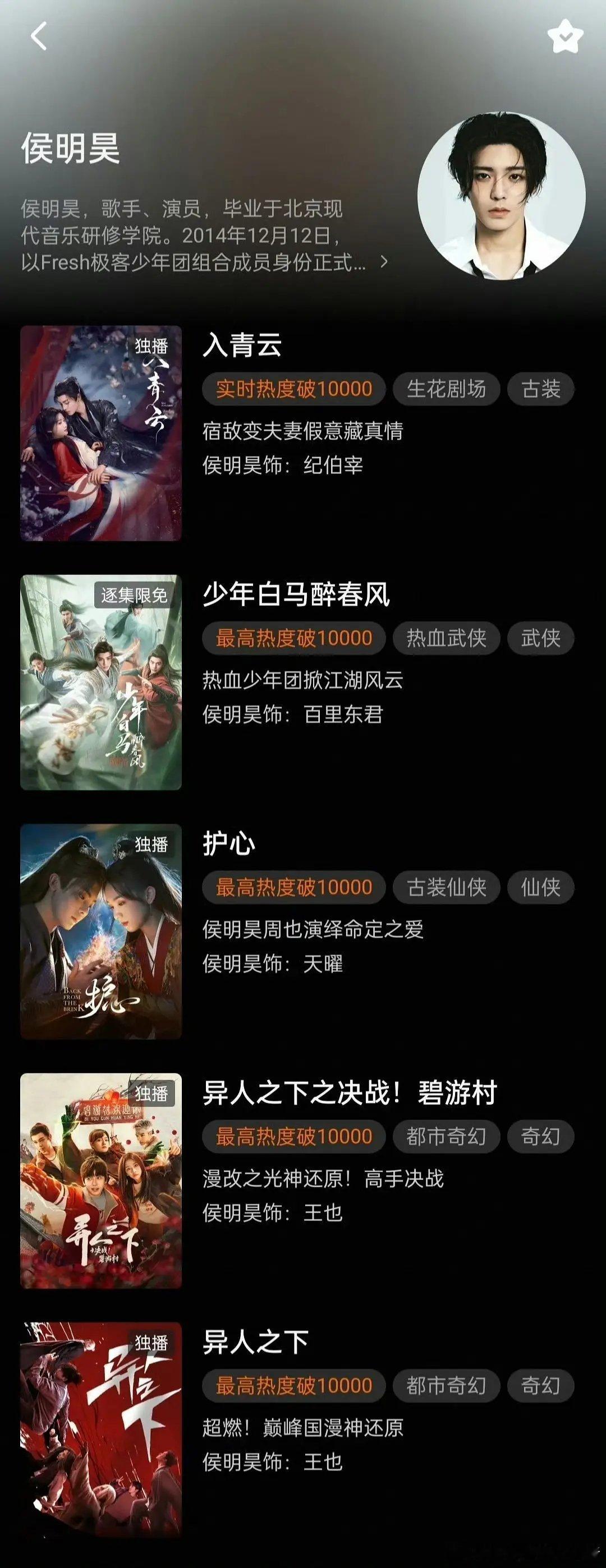 侯明昊入青云灯塔也破5000➕了,👖站内已经有五部主演剧集破万的了,更能证明