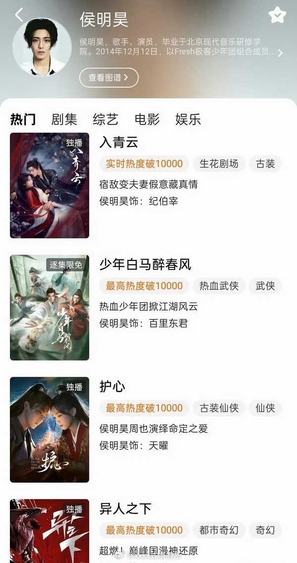 入青云是👖第39部破万剧,39部剧里侯明昊就占了四部