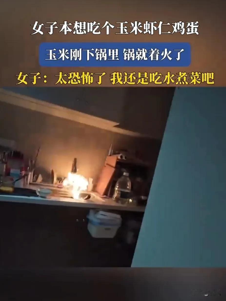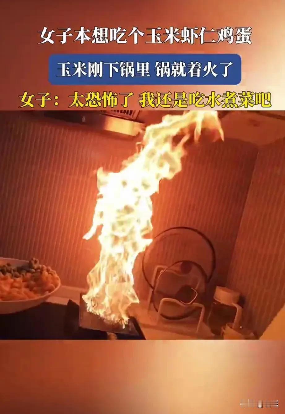 女子第一次下厨,本想吃个玉米虾仁鸡蛋 没想到玉米刚下锅里,锅就着火了 一看视频,明白为啥着火了 玉子烧啥时候用来炒菜了,不都是煎东西用的吗?还有冷冻的玉米粒,都不解冻一下吗?高温热油,不合适的锅再加上冷冻的玉米粒,不起火怎么可能?没爆炸都算好的。 灭火的动作也是错的,用锅盖一盖就好了,把锅扔洗碗池里的操作也是醉了。不过玉子烧也没锅盖。 炒菜的顺序也是错的,玉米虾仁鸡蛋,不应该先炒鸡蛋?怎么先放玉米? 不得不说女子挺冷静的,不慌不忙。第一次可以理解,但是建议以后做之前多看看教程和视频,危险的事情少发生,少吓人。