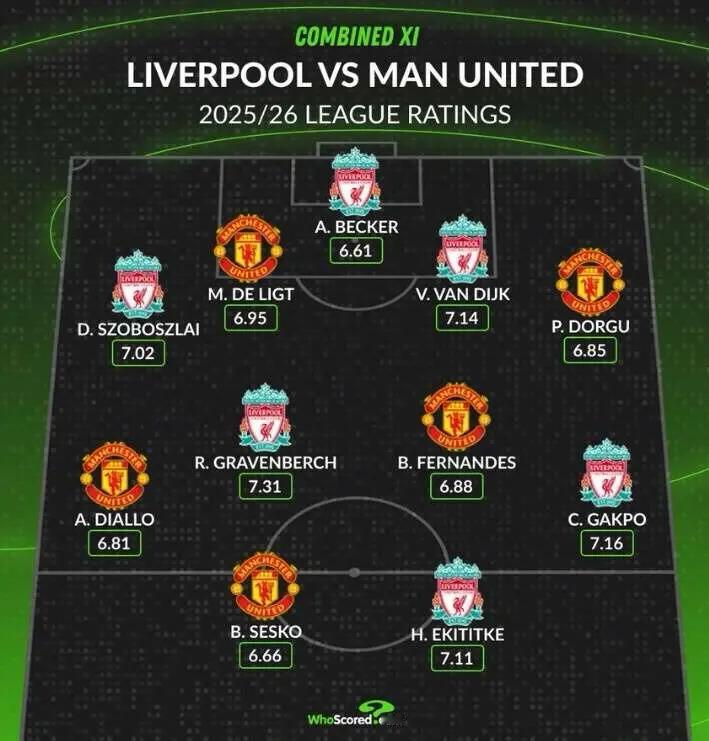 Whoscored评选了利物浦和曼联本赛季英超场均评分最高阵容,利物浦6人,曼联5人。