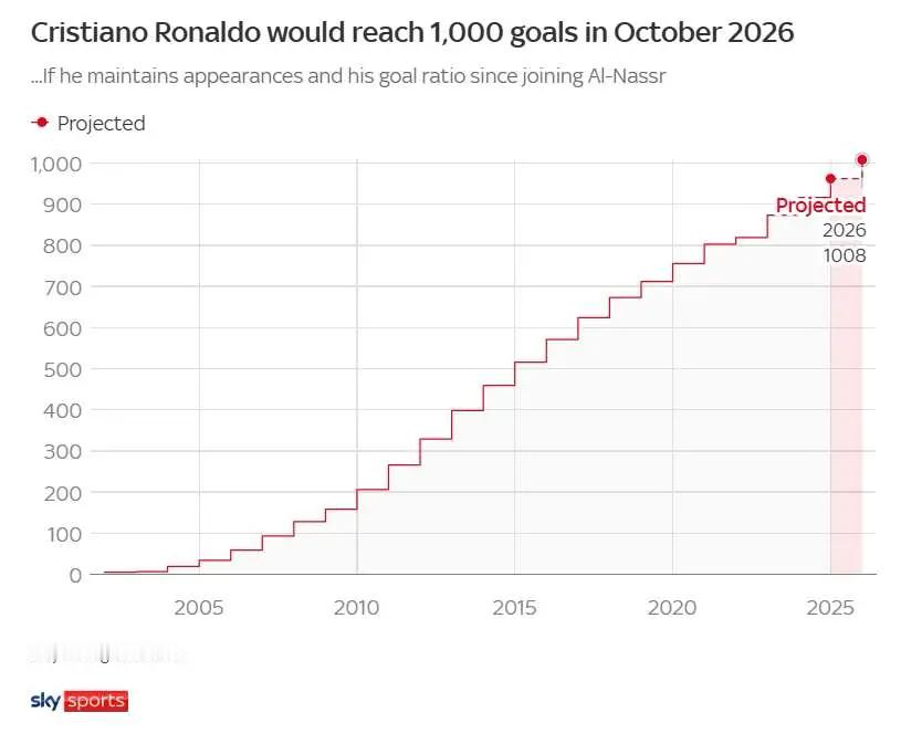 C罗在曼联、皇马、尤文、葡体、葡萄牙国家队、利雅得胜利打进949球,天空体育预测,根据C罗目前的进球效率,他预计将在2026年10月,成为历史上第一位进球数达到1000的球员。