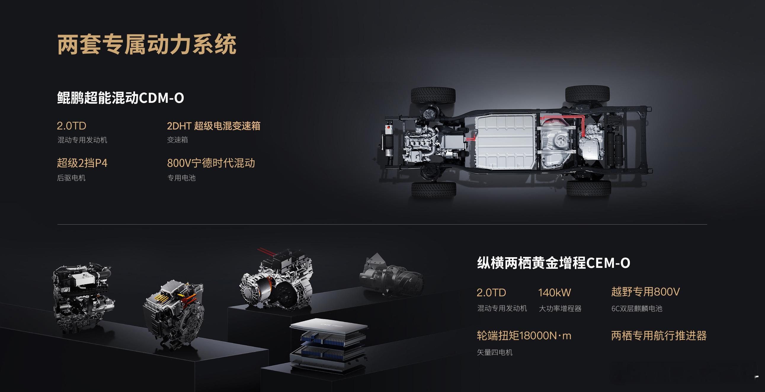 至于CDM-O鲲鹏超能混动,配备2.0T纵置混动发动机,最高热效率45.95%,峰值155kW/340N·m,亏电油耗7.95L/100km,发电功率150kW(峰值)/100kW(持续)