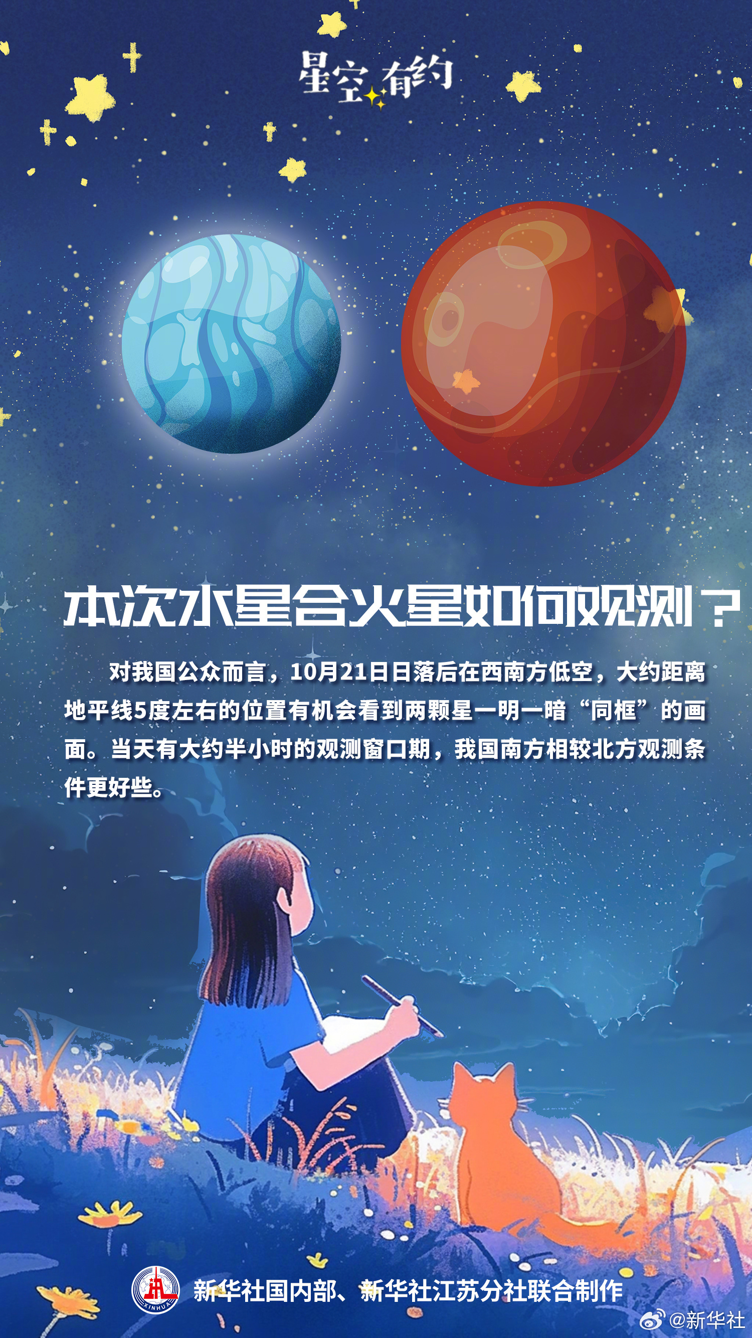#星空有约#【#21日看水火之约#】10月21日将迎水星合火星。当天日落后,水、火两星将“携手”出现在西南方低空,我国公众有机会看到水星、火星一明一暗“同框”的“星空约会”。