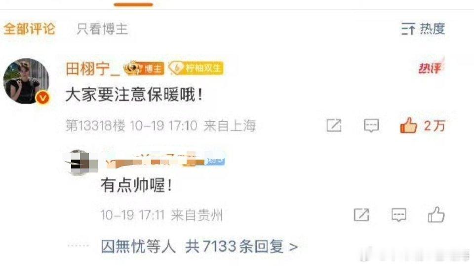 网友说梓渝刚刚代言了鸭鸭没有正式官宣,田栩宁又在帮忙催销量了,在微博评论区留言“大家要注意保暖哦!” ​​​