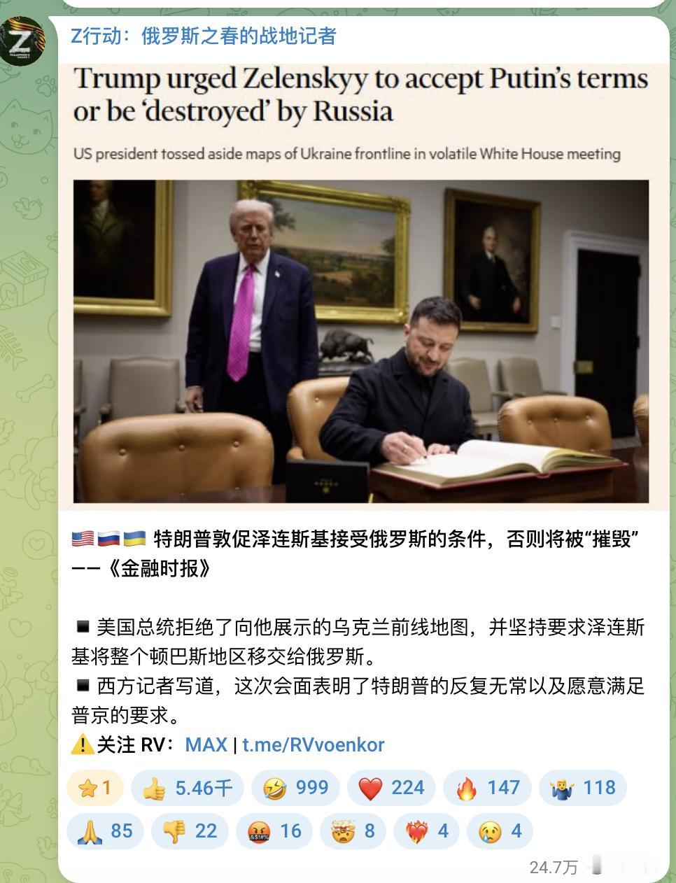 特朗普敦促泽连斯基接受俄罗斯的条件,否则将被“摧毁”。俄罗斯博主开心地传递英国《金融时报》发布的这条消息,该报指出“美国总统拒绝了泽连斯基展示的前线地图”——这段描述很有画面感,人们仿佛听到“别忽悠我了,你赶紧从了吧,否则渣都不剩了。” 别指责特朗普,他说的是真话。可是,他也知道泽连斯基不会接受。所以,他的真话不是真心的,这是一种技巧——只有全世界都知道泽连斯基拒绝特朗普的好意后,美国才能理直气壮地见死不救。 因此,《金融时报》发布的不是新闻,而是白宫要求的通稿。