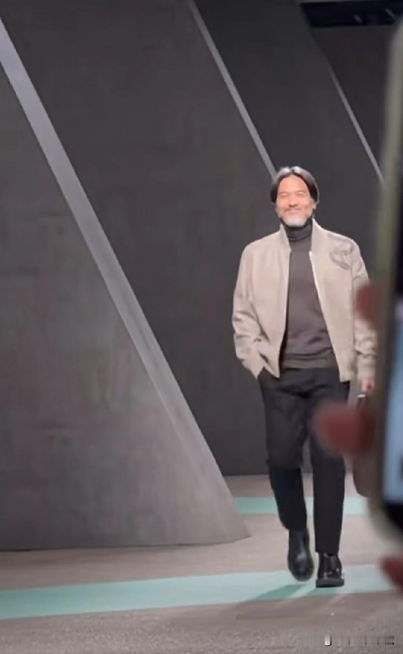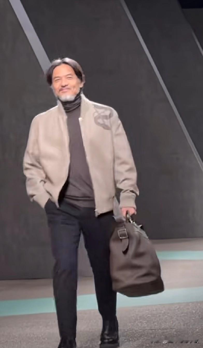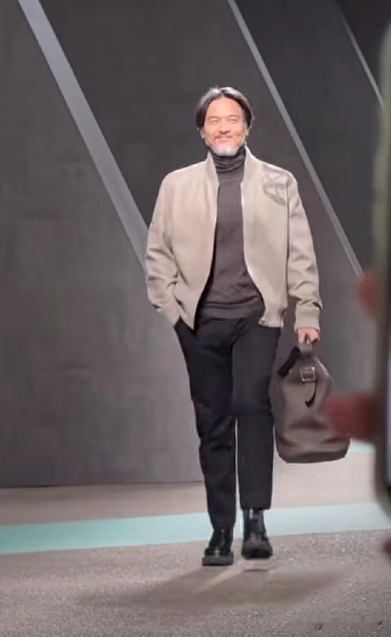 冯德伦花白胡子拉碴,但是依然帅气,魅力四射!一件浅色夹克外套,手提爱马仕包包,胡