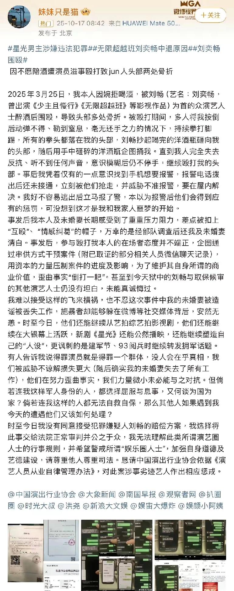现在是法治社会,明星身份可不是什么护身符!这个明星刘某畅喝酒聚会时殴打了一个现役军人,事后他们在派出所竟然集体串供,说是因为情感问题互殴… 好在当事人的部队介入了这件事情的调查,还原了这个现役军人的被殴打的客观事实。 明星这个身份 或许是正面形象的代表 却绝对不是可以用来 逃避法律责任的护身符 当时具体的情况 还是看看当事人 整理并发出的内容吧 看完了之后 大家又有什么感想呢?