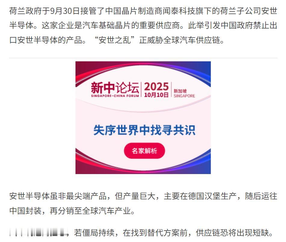 荷兰终于撑不住了,开始准备道歉服软!根据联合早报10月19日报道,荷兰经济部长卡雷曼斯现在竟正准备求见中国政府官员,商讨如何化解围绕晶片制造商安世半导体(Nexperia)的僵局。 之所以如此,是因为现在荷兰政府实在是撑不住了。 安世半导体生产的主要是车规级芯片,这些产品是先在德国汉堡生产,然后运往中国封装,接着再销售给全球各大汽车厂商。 因为荷兰政府强行接管安世半导体,导致这个生产链条已经出现剧烈动荡,如果这种状态继续持续下去,那么全球汽车产业链将受到巨大冲击。 所以现在各大汽车厂商都在向荷兰政府施压,表示如果不解决这个问题,那么汽车供应链都将因此中断。 欧美各大汽车厂商,比如说奔驰、宝马、福特、通用、特斯拉等,影响力是非常巨大的,现在它们开始集体施压,荷兰政府现在承受压力之大,可想而知。 因此,他们现在实在是撑不住了,恐怕荷兰政府也没有想到,自己对安世半导体的这个劫掠行为,最后却是搬起石头砸了自己的脚,搞得自己现在已经下不了台,这个时候摆在荷兰政府面前的只有一条路了,那就是道歉服软。 只不过,做出了这样的事情,显然不是轻易就可以了结的。 因此,荷兰荷兰经济部长卡雷曼斯,现在已经亲自出动,准备求见中国政府官员,“积极斡旋以化解僵局”。想都不用想,为了化解这个僵局,接下来荷兰政府必定要“大出血”才行。 不得不说,现在荷兰政府的表现,真是令人啼笑皆非。 早知如此,何必当初呢?