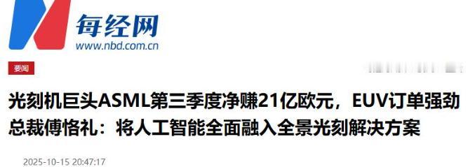 [微风]都反水了?荷兰也未曾预料,ASML正式宣布结果,荷兰下手有点早了! 荷兰光刻机巨头ASML最新财报一出炉,整个半导体圈都炸了锅。第三季度净销售额75亿欧元,净利润21亿欧元,毛利率稳稳站在51.6%的高位。 乍一看数据挺亮眼,但细扒之下,中国市场的占比却像坐了过山车——从上一季的47%骤降至42%,而ASML自己更是直接泼冷水:2026年中国营收占比可能跌到20%。 这哪是正常波动?分明是荷兰政府前脚刚对中国企业下手,后脚自家王牌企业就遭了反噬! 荷兰“明抢”惹怒中国,反制拳拳到肉。就在ASML财报发布前几周,荷兰突然发难,以“国家安全”为由试图强抢中企安世半导体的控制权。这一手操作直接捅了马蜂窝。 中国商务部火速反击,祭出稀土技术出口管制大招,从开采、冶炼到磁材制造全链条封锁,连技术图纸、工艺参数都不放过。 商务部发言人放话:“民用用途合规申请照样批”,但潜台词谁都懂——稀土可是光刻机光源和镜头材料的命根子,ASML的高端设备离不开中国稀土。荷兰这波操作,简直是搬起石头砸自己的脚。 更讽刺的是,ASML自己交出的成绩单,成了荷兰“误判”的铁证。三季度新增订单54亿欧元看似超预期,但扒开结构看,存储芯片订单占比从16%飙升至47%,全靠AI热潮硬撑。 而中国这个曾经的“金主爸爸”,却成了最大变数。ASML CEO傅恪礼亲口承认:“2026年中国需求将大幅下滑”。 为啥?因为荷兰跟着美国制裁,卡住了ASML对华出口浸没式DUV光刻机——这可是毛利率最高的产品!中国客户提前囤货后,后续订单自然雪崩。 荷兰政府想“卡脖子”,结果先勒紧了自家企业的钱袋子。 荷兰可能低估了中国的反制速度。就在ASML财报发布同一天,上海微电子在工博会上首次公开EUV光刻机参数图,直接捅破了国产光刻机的“窗户纸”。 更狠的是,华鑫证券爆料国产600系列光刻机已实现90nm量产,28nm浸没式光刻机研发进入冲刺阶段。虽然离ASML的顶尖技术还有差距,但别忘了——上海微电子靠紫外光源硬生生突破22nm工艺的消息,早就在业内传开。 以前中国买不到高端光刻机,现在连稀土技术都管制了,国产化只能加速。ASML在中国市场的份额从49%跌到20%,说不定只是开始。 当然,ASML也在找退路。财报里反复强调“AI投资强劲”,甚至拉来法国AI公司Mistral合作,想用人工智能优化光刻机效率。但AI芯片再火,也补不上中国市场的窟窿。 更扎心的是,美国《芯片法案》补贴下,三星、台积电疯狂扩产,结果ASML三季度韩国订单占比从28%暴跌到15%,美国占比却从3%蹿到21%。客户都跑美国建厂了,荷兰这波制裁,反而帮美国做了嫁衣。 ASML的财报像一面镜子,照出了荷兰的短视。想靠“明抢”打压中国,结果自家企业先遭殃;想卡中国脖子,却逼着国产光刻机加速破局。 根据公开数据,ASML 股价在 2025 年 10 月 20 日收盘时,涨跌额为 + 9.68,涨跌幅为 + 0.95%,股价为 1029.27 美元。荷兰政府是不是该反思:下手这么早,到底图啥? 这场博弈才刚开始,荷兰的误判会付出多大代价?中国光刻机真能借此逆袭?评论区等你开杠!