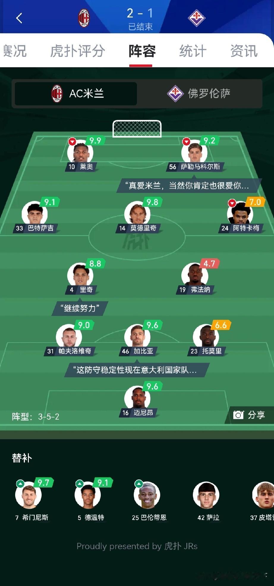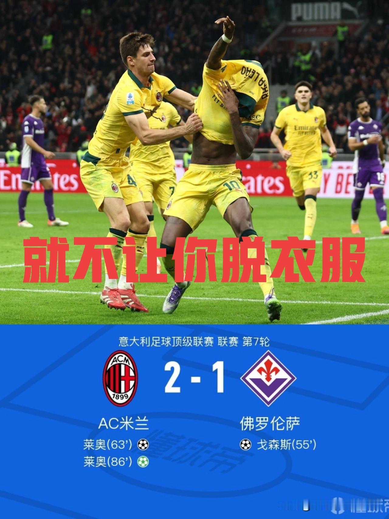 莱奥一笑,生死难料!本来还想脱衣庆祝,结果被加比亚强行拽下来了,这一幕笑死我了。[偷笑] 莱奥就是那种米兰球迷怒其不争浪费天赋吐槽两星期,结果一场比赛又爱上他的球员。如此循环往复! 不得不说现代足球就是得中场者得天下,米兰中场有了魔笛,档次升高了好多。还是那句话,有魔笛的球队都是争冠队。 其实这赛季米兰最大的变化就是有些场次踢的不好看,但能赢球,上赛季这种比赛大概率就是输了。所以阿莱格里还是有点东西的,毕竟是冠军教练。 最后夸一夸加比亚,是他拽着莱奥球衣没让脱衣庆祝。[赞][赞][赞]