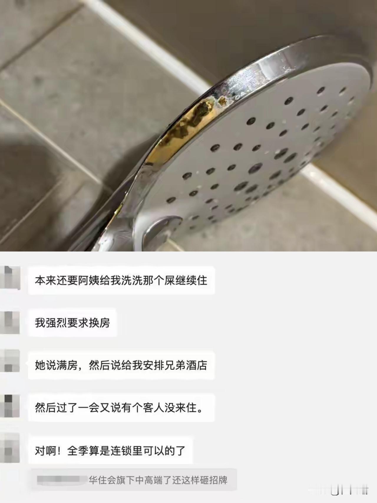 北京,女子花678块订了某品牌酒店双人房,入住后朋友洗完澡突然尖叫,女子跑过去发现花洒侧面沾着一块黄褐色的东西,凑近一闻,那股味让她头皮发麻:居然是粪便。 她立马喊来前台,工作人员看完一直道歉,但离谱的是,他说酒店没空房了,打算让保洁阿姨洗干净,让她们继续住。 女子当场拒绝,谁知道这花洒被弄过啥?就算洗了也根本不敢用啊。僵持半天,酒店才说有间客人预定了没入住的空房,把她们转移过去。 第二天,酒店一直没主动联系谈解决方案,直到傍晚女子要赶飞机了,负责人才露面,说能退房费,但赔偿的事他们没权限,要上报上级,之后就没了下文。 大家最想不通的是,花洒上怎么会有粪便?要么是前房客故意搞破坏,要么就是保洁太敷衍,擦完马桶的抹布又擦花洒。但不管哪种可能,都说明酒店管理存在漏洞。 还有就是酒店的态度,花六百多住中高端酒店,遇到这种恶心事,居然只想着洗洗继续住?有网友吐槽,这完全没有考虑客人的健康和感受。 酒店连最基本的卫生都保证不了,再响亮的品牌也会失去顾客的信任。 提醒大家入住酒店后最好先检查一下花洒、马桶这些地方,消毒湿巾,一次性用具不能少,能不用的东西尽量不用。