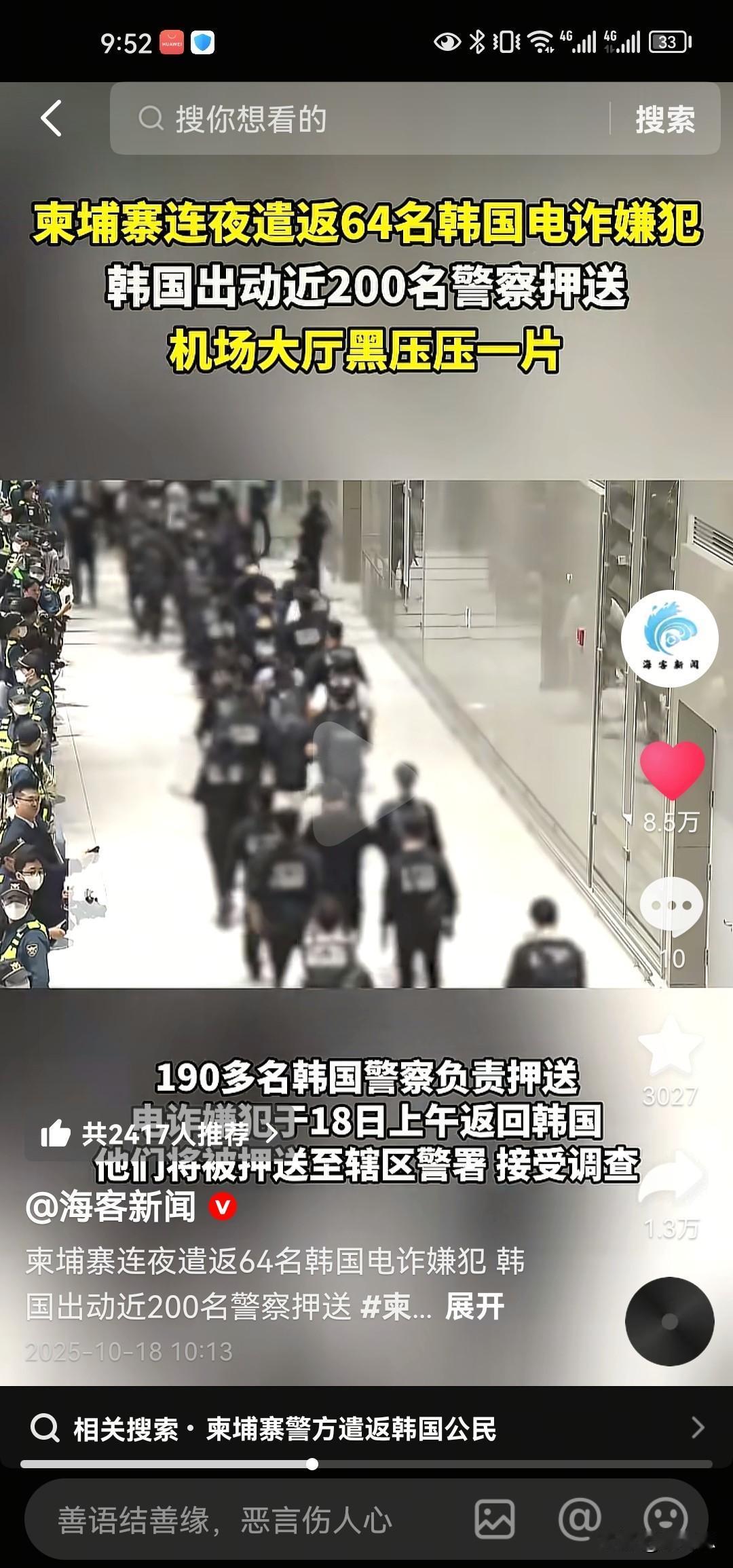 这次真要表扬思密达,让人刮目相看。柬埔寨连夜遣返64思密达电诈犯。韩国出动200名警察押送,机场大厅黑压压一片。世人终于看到了思密达的实力,人狠话不多。值得嘉许一下[赞][赞][赞]如果全世界都如此行动起来打击诈骗,受害人就被越来越少。