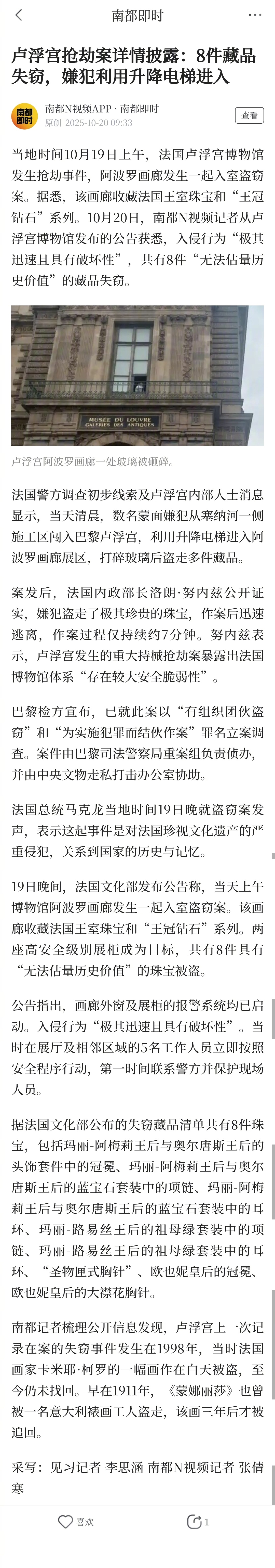 #卢浮宫8件藏品失窃#【卢浮宫抢劫案详情披露:8件藏品失窃,嫌犯利用升降电梯进入】#卢浮宫8件失窃藏品清单#当地时间10月19日上午,法国卢浮宫博物馆发生抢劫事件,阿波罗画廊发生一起入室盗窃案。据悉,该画廊收藏法国王室珠宝和“王冠钻石”系列。10月20日,南都N视频记者从卢浮宫博物馆发布的公告获悉,入侵行为“极其迅速且具有破坏性”,共有8件“无法估量历史价值”的藏品失窃。