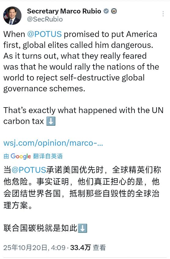 [微风]美国国务卿鲁比奥今天(北京时间10月20日)发文写道:“当特朗普总统承诺美国优先时,全球精英们称他危险。事实证明,他们真正担心的是,他会团结世界各国,抵制那些自毁性的全球治理方案。联合国碳税就是如此。” 鲁比奥的表态不仅是对“美国优先”政策的强硬辩护,更是对现行全球治理体系的直接挑战。这位古巴裔的共和党鹰派人物,从佛罗里达州众议院议长到美国国务卿,其政治生涯始终与“反华”“强硬外交”等标签紧密相连。 如今,他站在特朗普政府的外交前台,用“抵制自毁性方案”的论调,试图为美国的单边主义行动披上“团结世界”的外衣。 鲁比奥口中的“自毁性全球治理方案”,直指联合国碳税等跨国环境政策。这些方案主张通过全球统一征税应对气候变化,但在美国看来,这无异于削弱其经济主权。特朗普政府早在第一任期就退出《巴黎协定》,第二任期更是变本加厉,撤销电动汽车补贴、放松传统能源开发限制。 鲁比奥的言论背后,是美国对多边环境治理的系统性排斥。这种排斥并非孤立事件,而是“美国优先”政策的一贯逻辑——以排他取代包容,以单边取代多边。特朗普曾明确表示,全球治理方案“让美国承担过多责任”,而他的目标则是“让美国再次伟大”,哪怕这意味着撕毁国际规则。 但鲁比奥声称的“团结世界各国”更像是一厢情愿。特朗普的“美国优先”政策早已引发全球争议。欧洲国家怨声载道,认为这一政策不仅损害经济利益,更破坏跨大西洋盟友关系。 就连美国传统盟友日本、韩国,也被迫承担更多军费,以换取美国的“安全保护”。在贸易领域,特朗普对中国、欧盟等加征高额关税,威胁要对中国商品征收60%甚至更高的关税,直接导致全球贸易额下降,供应链被迫重组。这种以邻为壑的做法,非但没有“团结世界”,反而加速了国际社会的离心倾向。 更讽刺的是,鲁比奥本人就是美国外交政策撕裂的缩影。这位曾因极端反华被中国两次制裁的政客,最近却公开表示“美国希望与中国建立相互尊重的关系”。 这种矛盾表态暴露了华盛顿的深层困境:一方面想通过极限施压维护霸权,另一方面又不得不面对经济反噬的现实。美国商界早已用行动投票——辉瑞公司CEO警告美国制药业离不开中国,波音等巨头高管组团访华寻求合作。鲁比奥的“抵制”论调,在现实利益面前显得苍白无力。 全球治理体系正在经历一场前所未有的压力测试。特朗普政府的“内部调整、外部收缩”策略,让多边机制面临崩塌风险。但与此同时,金砖国家等新兴力量正在填补空白。 新开发银行虽规模有限,却以平等治理模式挑战西方主导的国际金融秩序。中国提出的全球治理倡议,强调主权平等、多边主义,与美国的单边主义形成鲜明对比。 鲁比奥口中的“自毁性方案”,或许正是全球南方国家寻求公平发展的唯一路径。 鲁比奥的发文看似强硬,实则透露出美国对全球治理失控的焦虑。当联合国碳税等方案成为国际共识,美国的“抵制”更像是一场注定失败的逆流。 历史证明,任何试图以单边主义取代多边治理的尝试,最终都会被时代抛弃。鲁比奥和特朗普能否理解这一点?或许,答案就在全球南方国家的集体行动中,在那些被美国忽视的“自毁性方案”里。