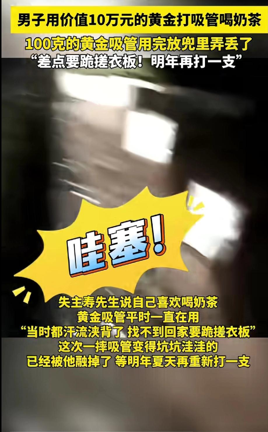 有钱任性!浙江一小伙报警,称自己丢失了一根吸管,让民警帮忙找找,民警一听还以为是捣乱的,结果,小伙却说,这根吸管不一般,是他用黄金打造的,专门用来喝奶茶,当得知这吸管有100多克时,民警都傻眼了![微风] 最近浙江街头出了件新鲜事,说起来挺有意思,就跟街坊邻居茶余饭后聊的家常似的——一个小伙丢了根喝奶茶的吸管,居然急吼吼地报了警,一开始民警还琢磨着,这事儿是不是有点小题大做,结果听完小伙的解释,在场的人都有点懵了。 事儿发生在一个晚上,天刚擦黑,那小伙骑着电动车在路边走,路过一个井盖的时候,车轮子碾上去“哐当”颠了一下,他当时也没太在意,继续往前骑,没一会儿摸了摸口袋,心里“咯噔”一下——随身带的那根喝奶茶的吸管不见了。 这吸管可不是普通玩意儿,小伙当时就慌了神,赶紧掉头往回找。晚上的街头车来车往,路灯照着路面有点晃眼,他蹲在地上扒拉着找了快半小时,眼睛都瞅酸了,愣是没看着那根吸管的影子。路边的行人路过,看他急得满头汗,还以为他丢了什么贵重手机,问了一嘴,他说丢了根吸管,人家也觉得奇怪,摇摇头走了。没法子,小伙只能掏出手机打了110,语气里满是焦急:“警察同志,我丢了根吸管,能不能帮我找找?” 接警的民警赶到现场的时候,心里其实犯着嘀咕。这年头,为了根吸管报警的还真少见,别不是谁闲着没事恶作剧吧?毕竟平时出警,不是邻里纠纷就是财物丢失,哪有拿吸管当回事的。直到民警走到小伙跟前,看着他一脸急得快哭的样子,不像是装的,才正儿八经问起情况:“小伙子,你这吸管是多贵重的东西,值得这么着急?” 小伙搓着手,声音都有点发颤:“不是普通吸管,是我专门订做的,用黄金打的,就为了平时喝奶茶方便。”民警一开始还没反应过来,以为自己听错了,追问了一句:“你说啥?黄金?”小伙点点头,补充道:“是啊,足足有100多克呢,按现在的金价算,得值十万出头了。” 这话一出口,刚才还觉得有点好笑的民警瞬间收起了轻松的神色,眼神都变了——100多克黄金打根吸管?这可不是小事,要是真丢了,损失可不小。他们立马意识到,这事儿压根不是什么恶作剧,而是实打实的贵重物品丢失案。 后来跟小伙聊起来才知道,这根金吸管是他的心头好。小伙子平时就喜欢琢磨点特别的小物件,有人爱收藏手办,有人爱攒球鞋,他就觉得黄金这东西又实在又特别,干脆找人打了根吸管,专门用来喝奶茶。用他的话说,“平时出门带杯奶茶,用自己的吸管喝着舒服,再说黄金也不怕摔,没想到今儿个栽在井盖这儿了。” 可在咱们普通人看来,这事儿就有点“超出想象”了。你想啊,咱们喝奶茶,要么用店家给的纸吸管,软乎乎的有时候还吸不上来珍珠;要么自己备个不锈钢的,十来块钱就能用好久,谁能想到有人会花十万块,用100多克黄金打根吸管?这可不就是“有钱任性”嘛。不过话说回来,人家花自己的钱,买自己喜欢的东西,说到底也是个人爱好,旁人也不好多说什么,就是这“爱好”的门槛,确实比咱们普通人高了不少。 民警这边可不敢耽误,既然是这么贵重的东西,得赶紧帮忙找。几个人围着小伙说的丢失地点转了一圈,先是问清了电动车颠起来的位置,又看了看路面的情况——那晚的路面挺平整,除了那个井盖有点凸起,其他地方都挺光滑。有个老民警琢磨了一下:“吸管是圆柱形的吧?掉在硬路面上,车一颠飞出去,肯定会顺着惯性往前滚,不会就在原地附近。” 几个人顺着小伙骑车的方向,往前找了大概十几米,就在路边的草丛边上,借着路灯的光,隐约看到一点金灿灿的东西。走过去一瞧,可不就是那根金吸管嘛!躺在草丛边的缝隙里,还闪着光,除了沾了点灰尘,一点没损坏。 信息来源:大象新闻 小伙见着吸管,瞬间松了口气,赶紧捡起来擦了擦,嘴里念叨着“还好还好,没被车压着,也没被人捡走”。民警看着他那模样,也跟着放心了,忍不住跟他开玩笑:“以后带这东西出门,可得揣好了,再丢一次,可不一定这么好运气能找着。”小伙连连点头,一个劲儿地跟民警道谢,说要是找不回来,他得心疼好几天。 这事儿后来在网上传开了,不少网友都在聊。有人说:“好家伙,我喝奶茶加个珍珠都得纠结半天,人家直接用金吸管,这差距也太大了。”还有人说:“这算不算炫富啊?好好的黄金,打根吸管喝奶茶,有点浪费吧?”不过也有人觉得,“只要钱来得干净,人家想怎么花是自己的事,收藏球鞋和收藏金吸管,不都是个人爱好嘛,没必要说三道四。” 更有意思的是,有人还琢磨起小伙说的“心疼好几天”,调侃道:“咱们丢个几百块的东西都心疼,他丢十万的吸管,心疼也是应该的,就是这‘心疼’的量级,跟咱们不一样罢了。”你一言我一语的,倒把这根金吸管变成了个小话题,有人觉得新鲜,有人觉得离谱,也有人从里头看出了点不一样的味道。