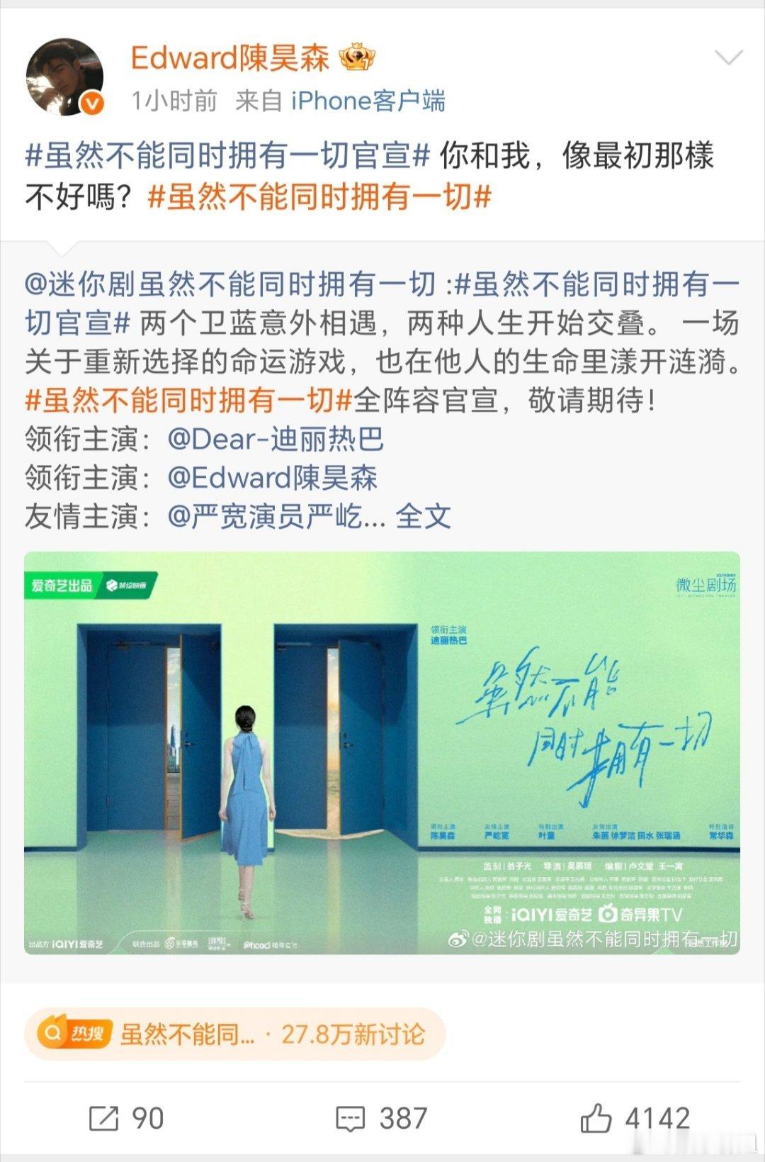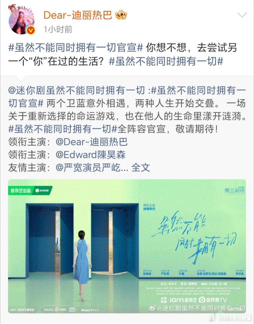 迪丽热巴陳昊森新剧官宣今天中午迪丽热巴陳昊森合作新剧《迷你剧虽然不能同时拥有