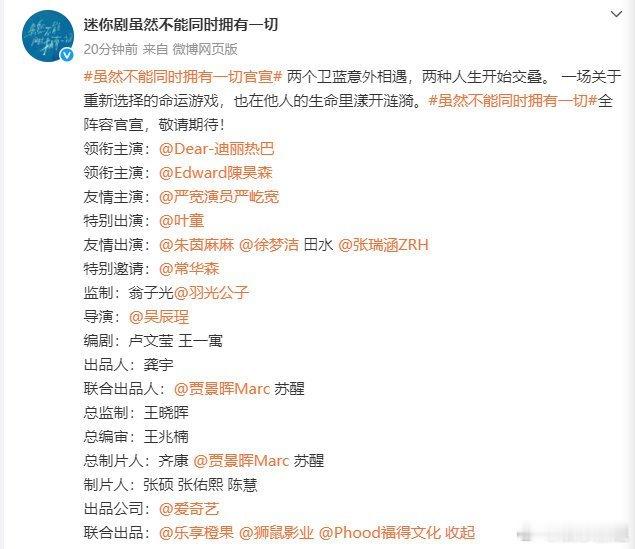 迪丽热巴陳昊森新剧官宣今天中午迪丽热巴 陳昊森合作新剧 《迷你剧虽然不能同时拥有一切 》官宣定档,期待卫蓝的AB人生早日相见。