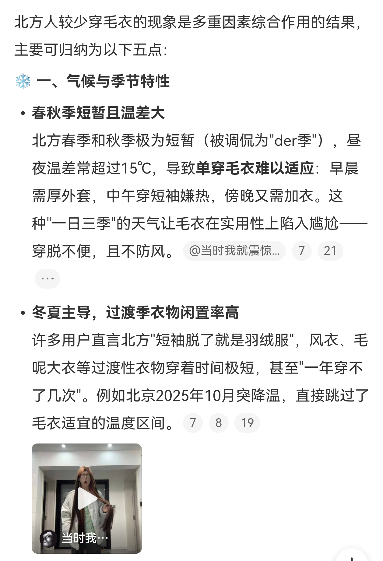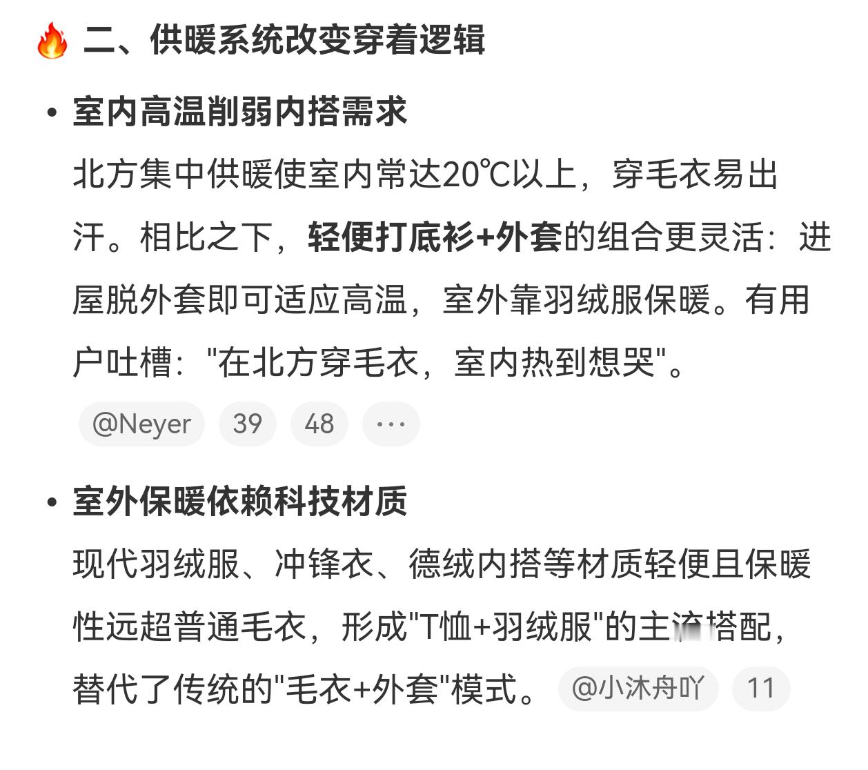 为什么北方人很少有人穿毛衣 北方冬天哪用得着毛衣“凑数”!出门靠抗寒羽绒服挡风,进门有暖气直接穿单衣,毛衣穿脱麻烦还显臃肿,早被加绒打底、轻羽绒替代了,保暖又利落才是王道~ ​​​