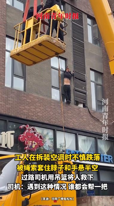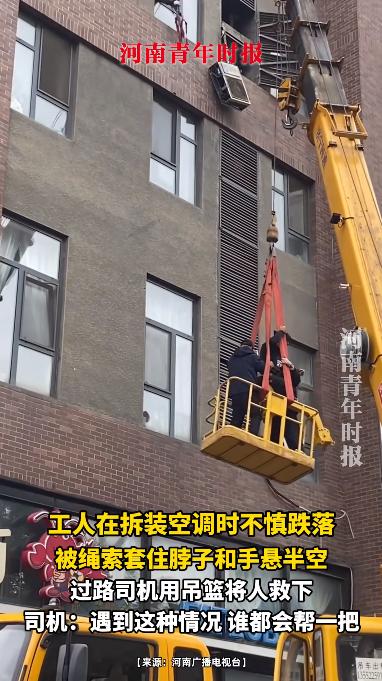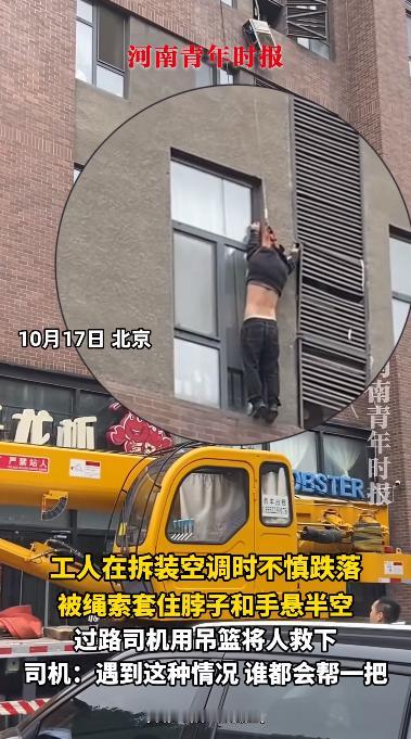 这太幸运了!10月17日,北京,一位工人在客户家里安装空调时,不慎从空调跌落,幸好安全绳吊住了他的双手和脖子,但他仍然被挂在半空中无法动弹,关键时刻一辆吊车恰好经过这里,司机用吊篮将工人救了下来。 麻烦各位读者点一下右上角的“关注”,留下您的精彩评论与大家一同探讨,感谢您的强烈支持! 最近北京就发生了一件惊心动魄的事,一名空调安装工人差点命丧半空,幸好被一辆路过的吊车司机奇迹救援,这个过程简直像电影桥段一样,网友们都说“这波运气逆天了”,但背后许多东西都值得我们反思。 事情发生在10月17日,北京的某个小区。那天,这位空调师傅和往常一样,赶到客户家里准备拆装空调外机。 高空作业对于他们来说几乎是家常便饭,久而久之,有的人难免就会对安全措施有些“掉以轻心”,觉得自己经验丰富,不会出事。可偏偏意外总是喜欢挑这些自信满满的人下手。 师傅正操作着,突然脚下一滑,整个人直接从楼上掉了下去。关键时刻,安全绳发挥了作用,把他在半空中吊住了。 但更大的危机也随之而来——绳索并没有像规范那样固定在合适的位置,而是缠在了他的脖子和手臂上。 这样一来,师傅不仅无法挣脱,还因为重力作用,身体完全悬挂,呼吸也变得越来越困难。而楼上的住户也被这意外吓到了,不知道怎么解救安装师傅。 就在大家手足无措的时候,一辆吊车正好路过小区门口。要知道,平时城市道路上想见到一辆吊车可不容易,何况是在最需要的时候出现。 吊车司机一眼看到半空中的工人,就知道非常危险。他把车停到楼下,稳稳地升起吊篮,靠近师傅,把他从绳索中解救出来,然后缓缓送回地面。整个过程紧张得让人喘不过气,但结局总算是有惊无险。 事后,这位司机师傅非常淡定地说:“换谁都会伸把手,这只是举手之劳。”可在旁观者心里,他已经成了真正的“救命英雄”。 这件事在网上引发了热议。有人感叹师傅命硬、运气好,也有人细细琢磨整个过程,发现其实每一步都离不开“规范”二字。 高空作业本来就有严格的安全要求,不光要用合格的安全带和安全绳,还得确保固定点牢靠,佩戴方式正确。 如果只是图省事,随便把绳子一系,出了意外,安全带反而会变成致命的“勒索”。更何况,现实中还有不少工人连最基本的“高处作业证”都没有,靠着“老经验”上阵,企业和平台监管又很松,久而久之,安全隐患就像定时炸弹一样,谁也不知道哪天会爆炸。 其实,这次事故还暴露出另一个问题:业主和开发商往往只关心价格和进度,却忽视了工人的资质与安全。 有的业主为了省钱,根本不查师傅有没有证件,甚至还有假证在网上流通。开发商和物业有时也只考虑设计美观,把空调外机位留在极不方便的地方,完全不考虑后期维护和安装的风险。最后,所有的压力和危险,全部压在了最底层的工人身上。 有人说,这位师傅是“命大”,有人说“运气爆棚”。但我们不能总指望每次都能有吊车路过,总有好心人伸手相救。安全意识不能靠碰运气,规范操作才是每一个高空作业者的底线。 对于平台和企业来说,加强岗前培训和严格证件审核,是最基本的责任。对于业主来说,别只图便宜,多问一句“有没有证”,多留意一下工人的安全措施,也是对别人生命的尊重。 开发商和物业,也应该在建筑设计阶段多为工人考虑,合理安排空调外机位,减少高空风险。 每一次高空作业背后都是一次生命的冒险。我们常说“安全无小事”,可真正做到把安全放在心上的人,还是太少。希望这次事件能敲响警钟,让更多人认识到,规范操作不是麻烦,而是保命的最后一道防线。 信源:《工人在拆装空调时不慎跌落,被绳索套住脖子和手悬半空,过路司机用吊篮将人救下》河南广播电视台
