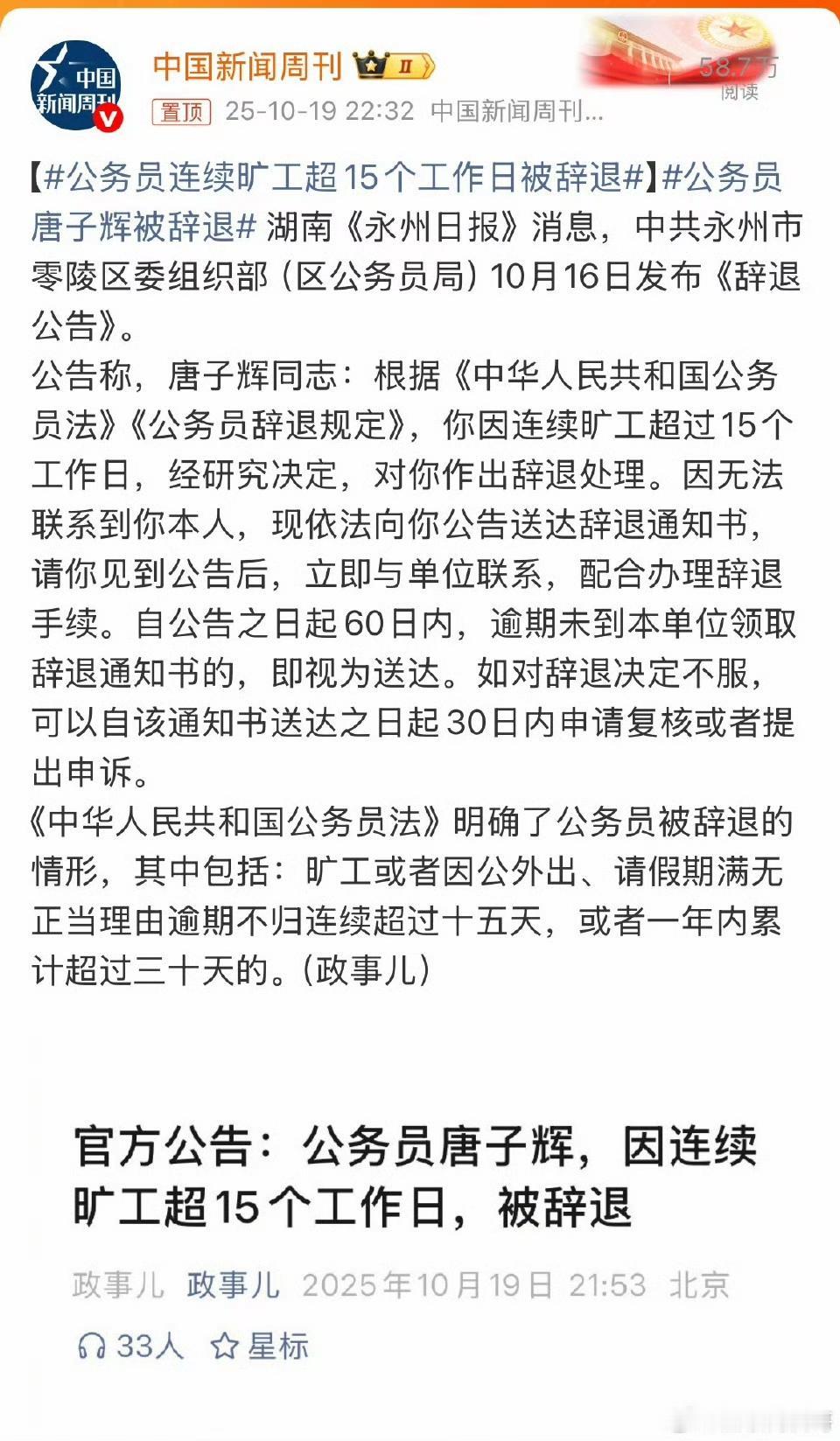 很多网友好奇,公务员也会被辞退。 那他这是故意的,还是?连续旷工15天啊,故意的可能更大。这就是想离开,主动使的招吧,肯定有更好的前途了! 其实,公务员辞退的情形有很多,规定一直是明确的,就看各地是不是愿意碰硬动真格。无论怎么说,永州开了个好头,接下来各地都会对突破规矩的现象动真格。公务员连续旷工超15个工作日被辞退 职场辞退 公司辞退 企业辞退 职场变相辞退 员工辞退风险 调岗辞退 中年辞退