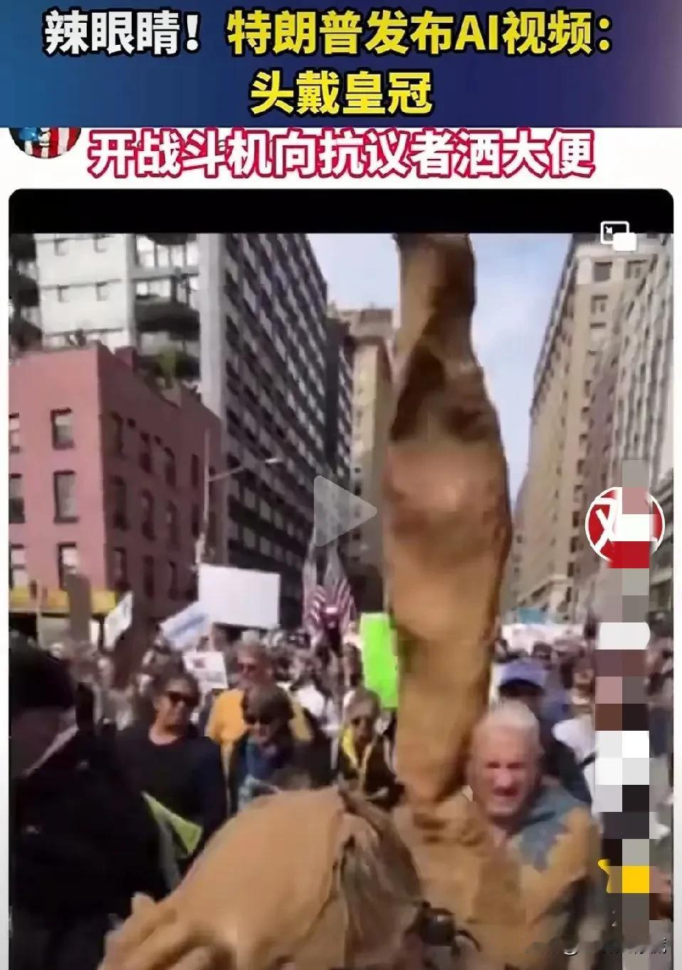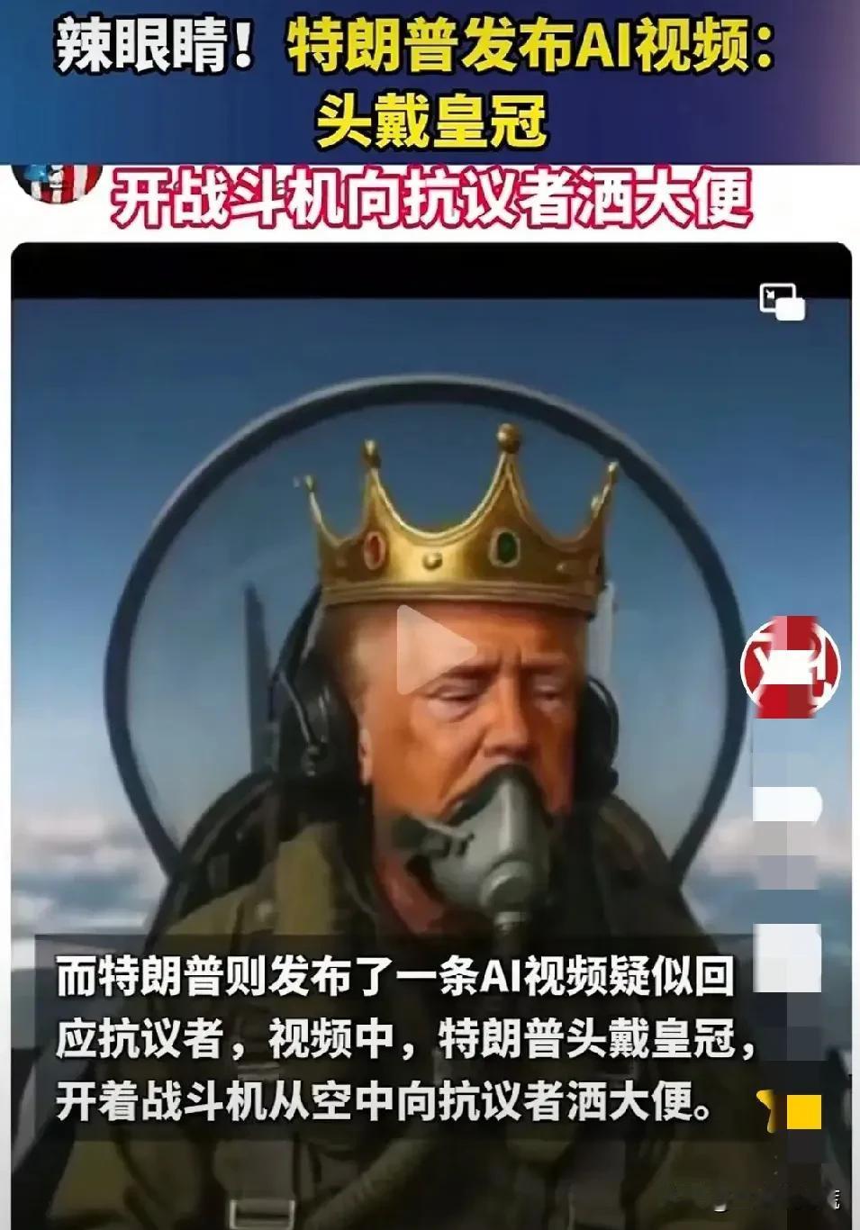 咱就是说 如果不是亲眼所见 我真不相信自己的眼睛 看到两个视频,一个是特朗普居然头戴皇冠,身穿国王大红袍子,坐着马车,挥手向大家致意。 还有一个是,他头戴皇冠,嘴上戴着防毒面具,坐着直升机,朝下面喷大粪。 哎呀妈呀,先不说这是啥意思,就这个装扮,都把我5岁的侄子逗笑了,他说,这个爷爷是在童话世界里吗[捂脸]? 这,还真把我问住了。 这是弄啥嘞,咱也不知道,咱也不敢问🤷🏻♀️